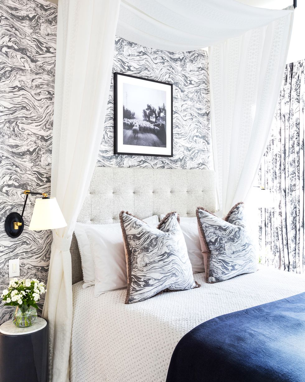 23 Prueba con una Cama con Dosel. Las camas con dosel añaden un elemento de grandeza. Pero no es necesario comprar una cama completamente nueva para probar el aspecto; simplemente agrega barras de cortina al techo y amarra tus tejidos fluidos, como se demuestra en este dormitorio de Ashby Studio.