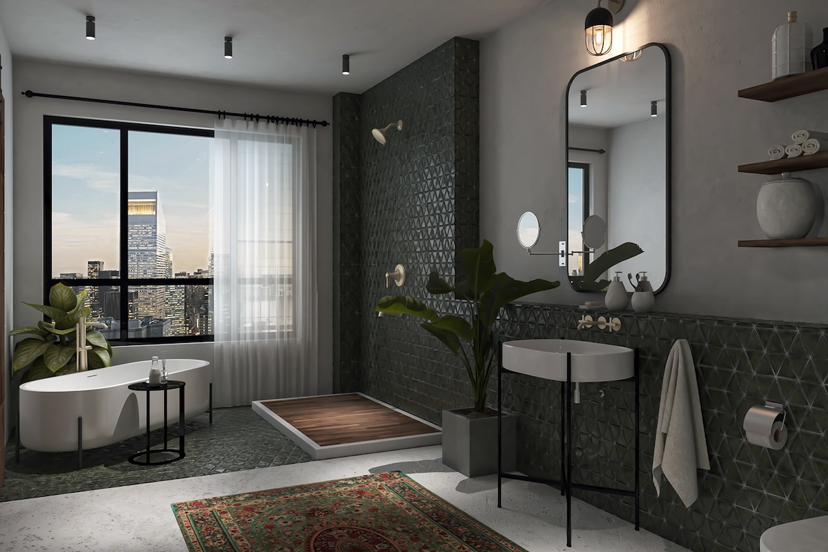 Los tonos verdes suaves van de la mano con la estética boho moderna del cuarto de baño. Combínalos con pausas en blanco limpio, elementos de madera pálida, puntos de anclaje en negro mate y accesorios de latón para obtener un resultado sereno y contemporáneo a la vez.