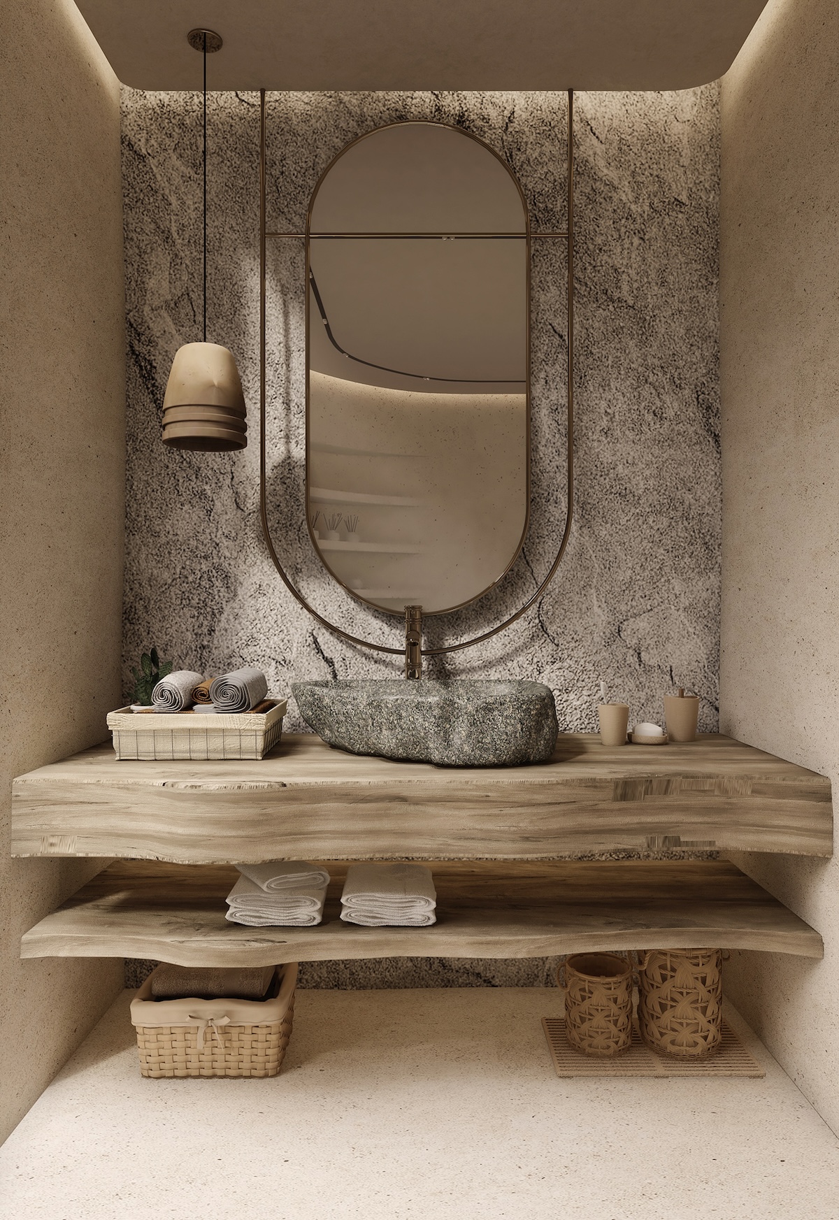 Atrévete con una experiencia de texturas profundas. Instale una pared salpicada de piedra con un robusto lavabo de piedra. Elija muebles de madera con bordes vivos en lugar de alternativas rectas y elegantes, y espolvoree accesorios de ratán.