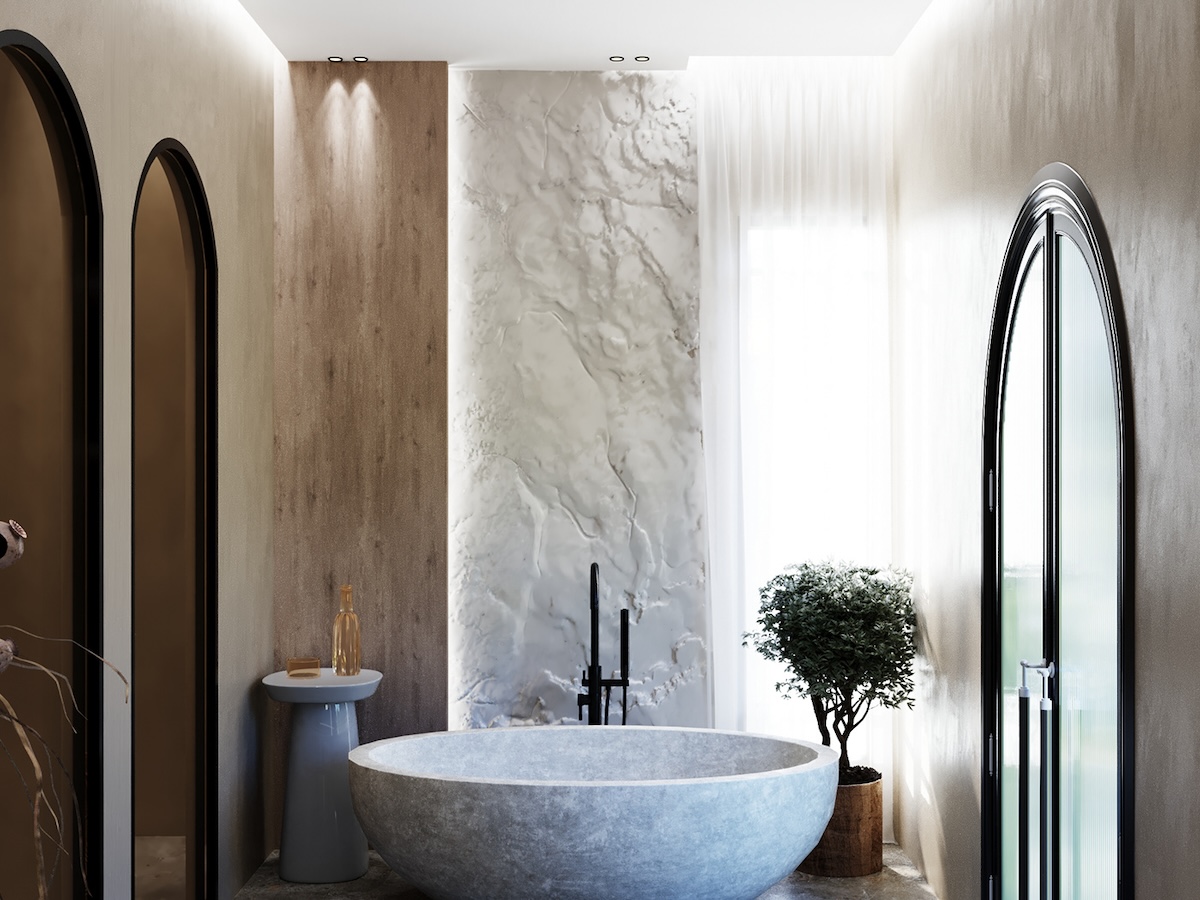 Un pequeño taburete de madera es el compañero ideal de una llamativa bañera de piedra. Redondea las esquinas de la habitación y los estantes de la pared para esculpir un espacio realmente único.