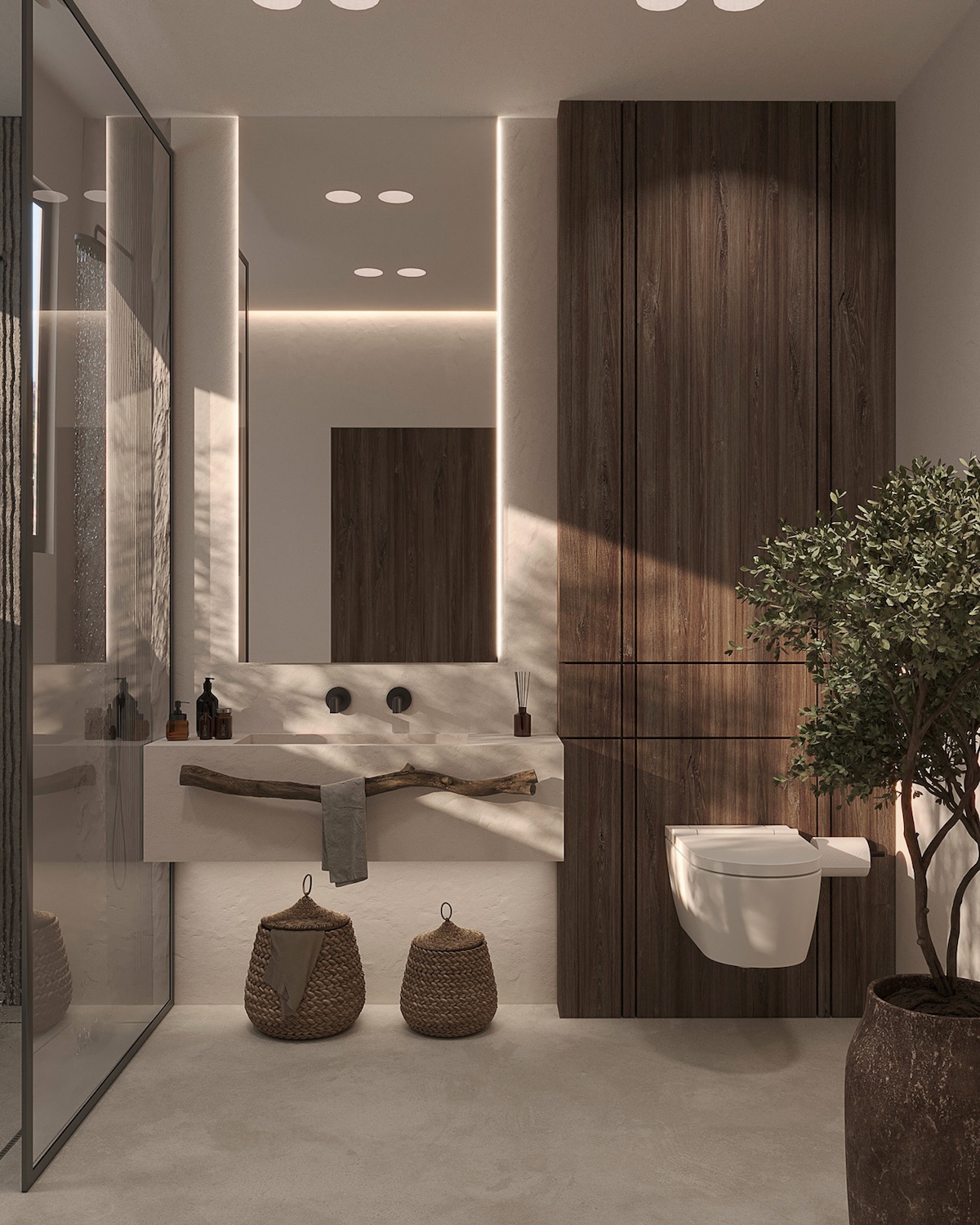 Un mueble de baño bohemio a medida aprovecha toda la anchura de la habitación. Dos lámparas de tocador crean un momento escultural en un extremo, mientras que una gran planta de interior domina la otra mitad.