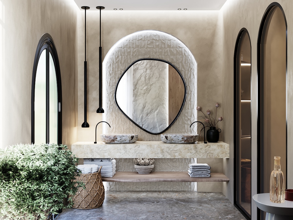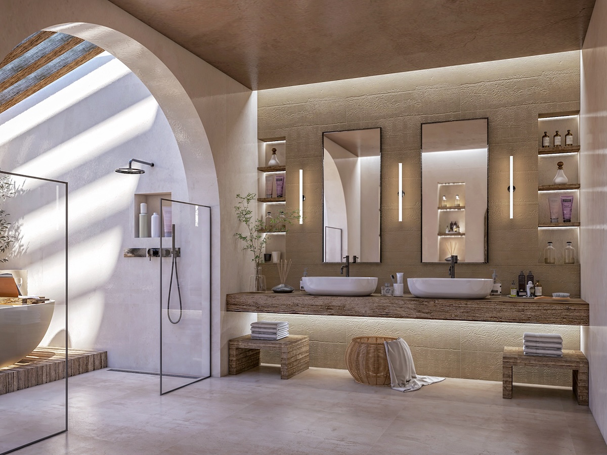 Introduce arcos para crear dramatismo y elegancia en tu baño bohemio. La luz natural entra a raudales en la zona de baño arqueada, mientras modernos apliques de pared iluminan dos lavabos. Dos espejos de baño completan el conjunto.