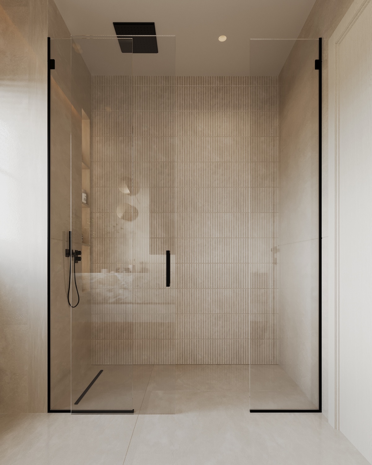 Una alcachofa de ducha de efecto lluvia se oculta en el techo para completar el acabado aerodinámico.