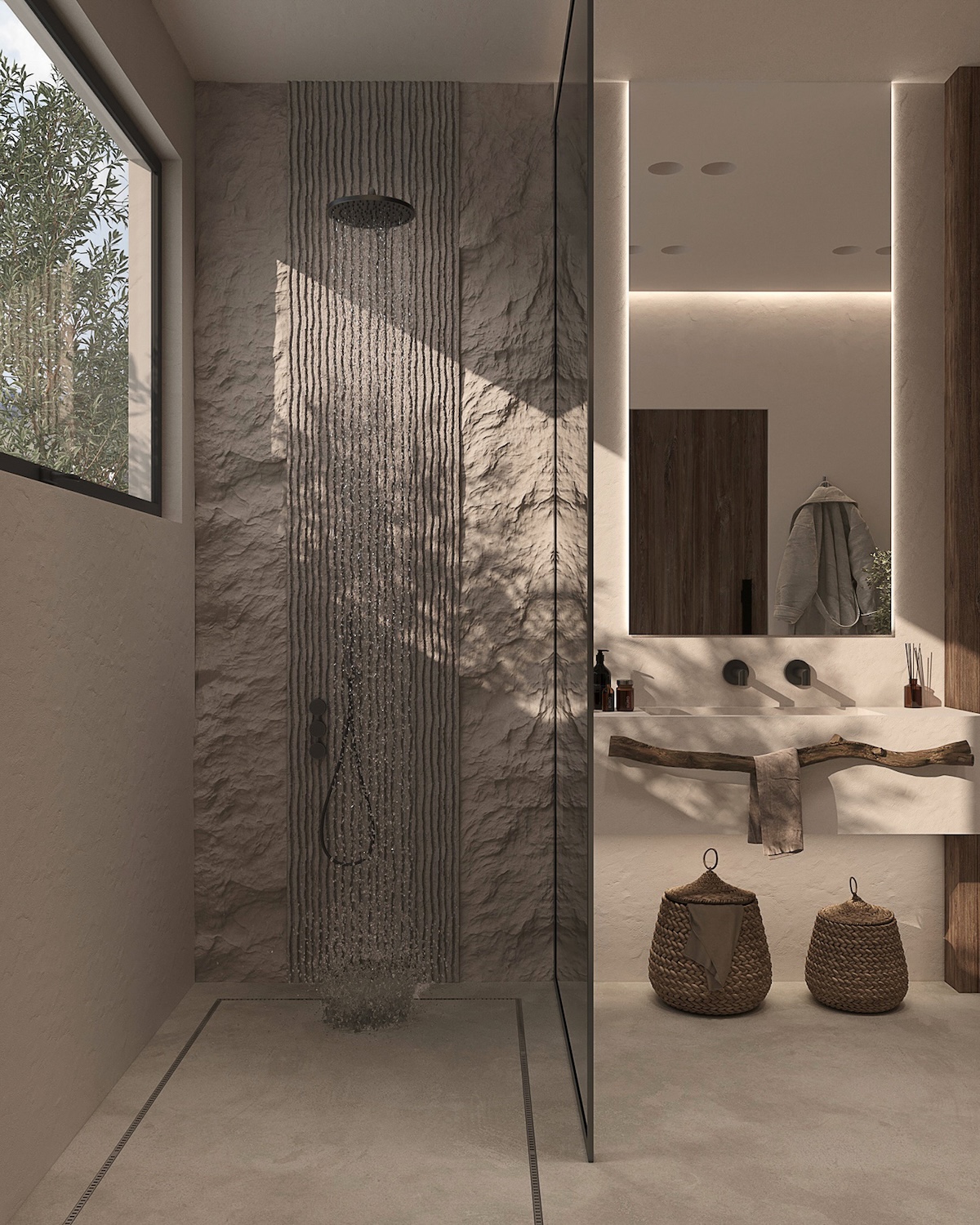 Dentro de la zona de ducha, una pared húmeda revestida de piedra crea una sensación de exterior.