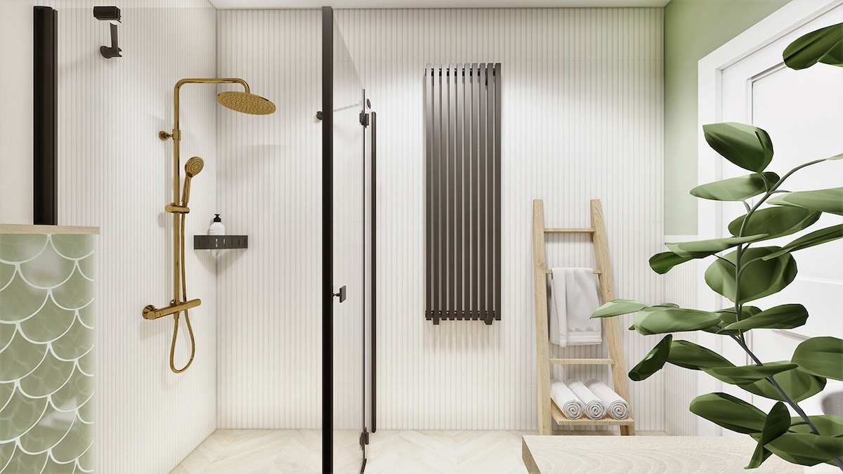 Este diseño de baño boho aporta calidez y textura a través de los azulejos de la pared, de color marrón dorado y lengüeta, y sus homólogos verdes complementarios. Los azulejos marrones como el bambú forman un capullo de color alrededor de una moderna bañera exenta, contrastando con su fresco acabado blanco. Los azulejos verdes llaman la atención sobre un fresco lavabo de hormigón.