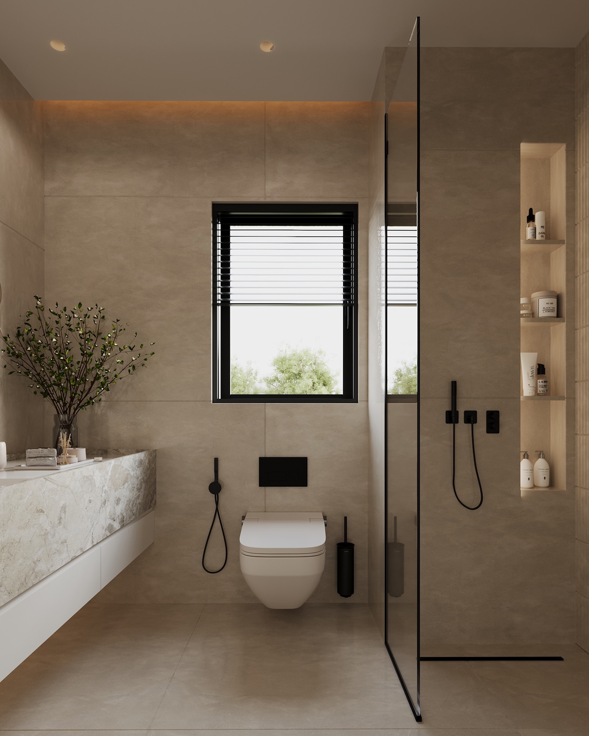 Los herrajes negros, los grifos y el portarrollos de papel higiénico a juego realzan las clásicas paredes de mármol blanco con un atrevido toque contemporáneo.