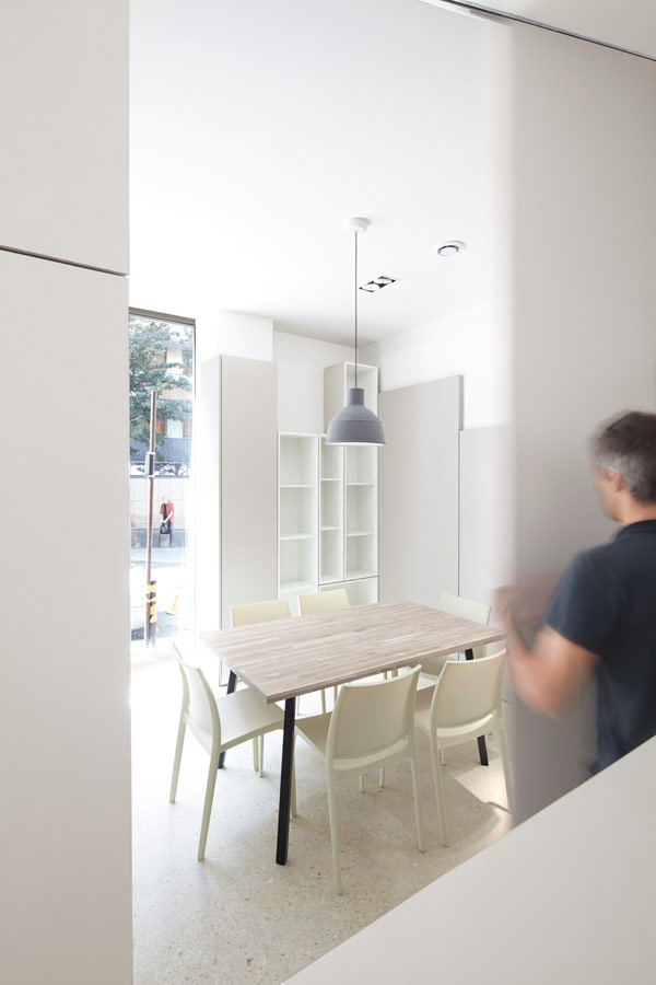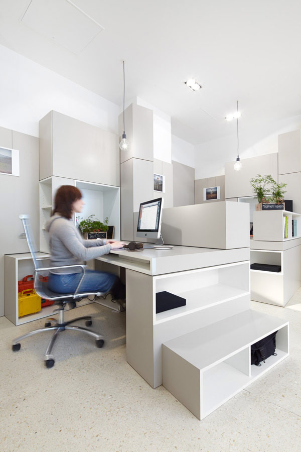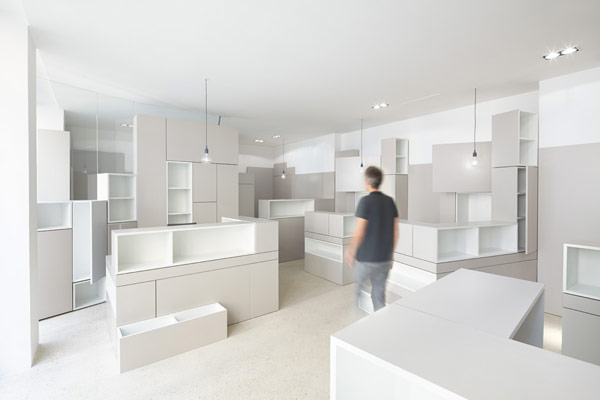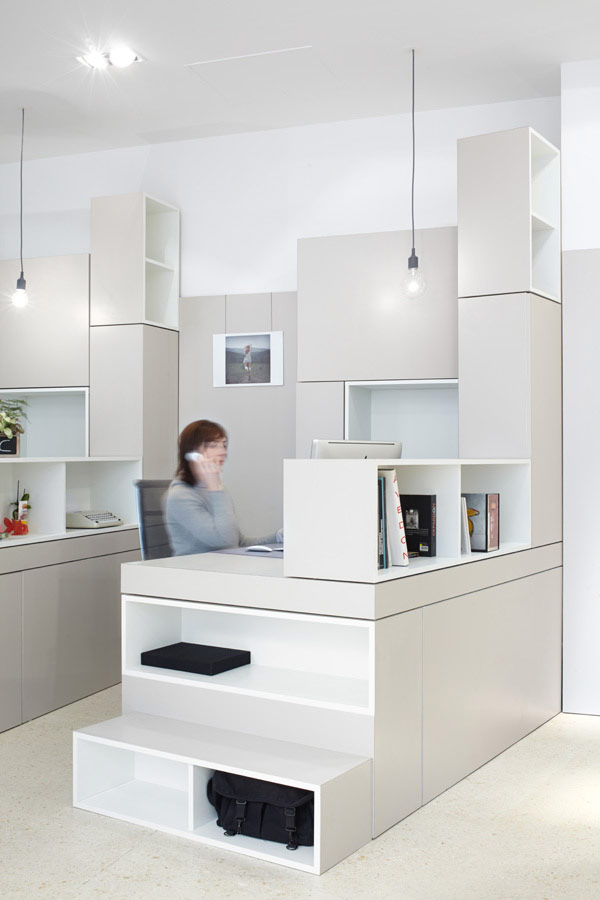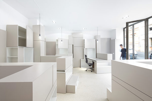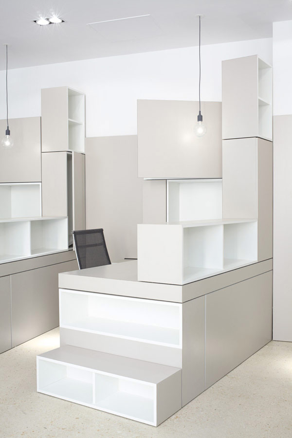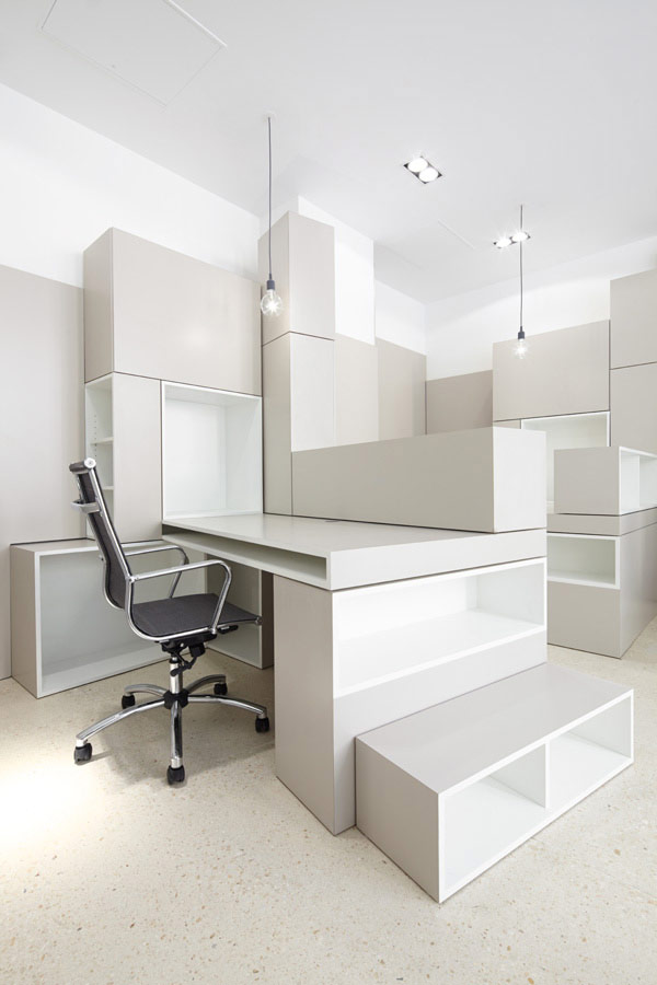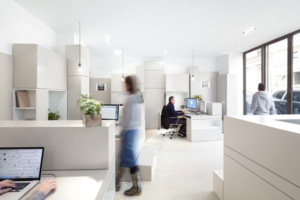 Las dimensiones de estas oficinas miden 65 metros cuadrados , un trabajo desarrollado y completado por h2o architectes quienes tambien se encargaron de la decoracion de los interiores y la muebleria , basandose en un diseño que explota el ambiente geometrico y de uniformidad.