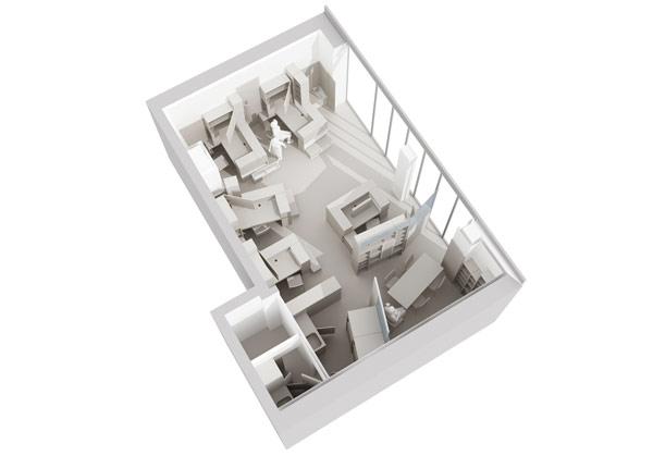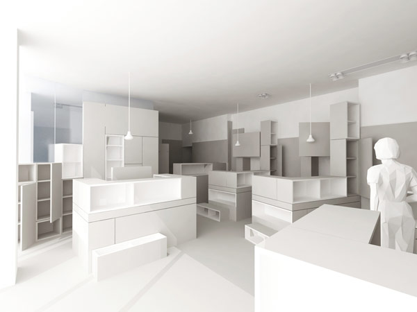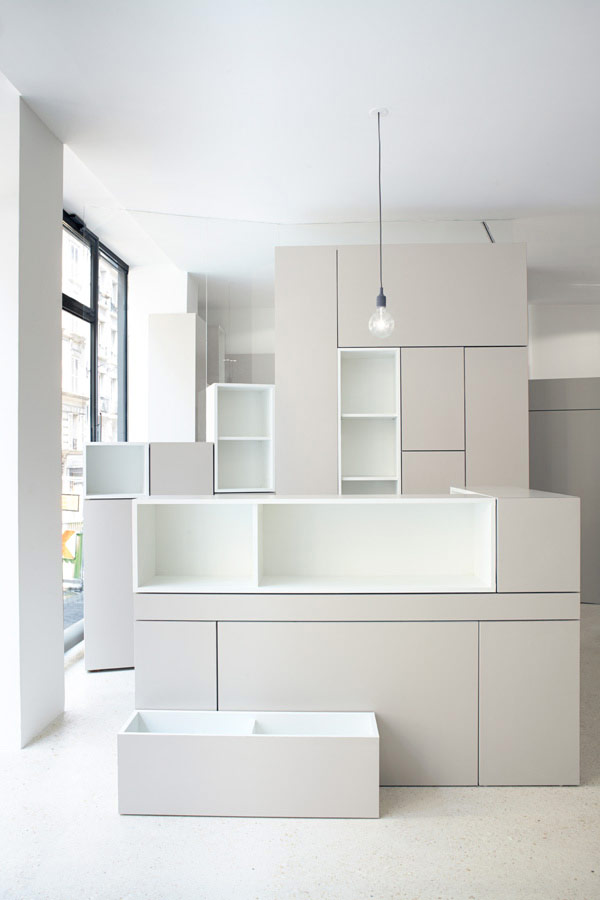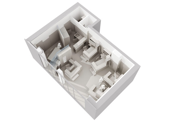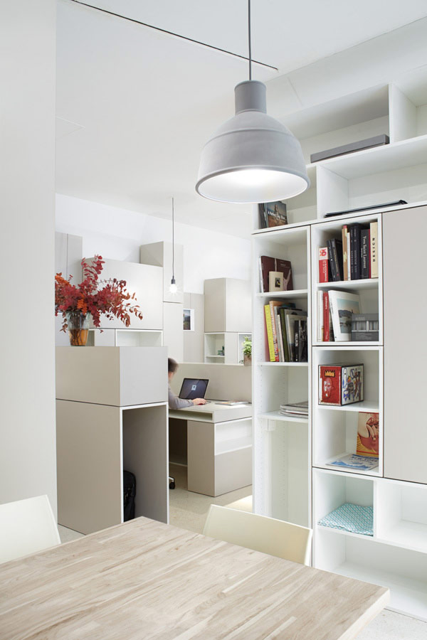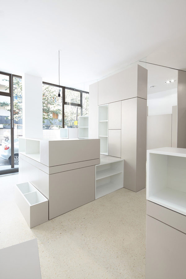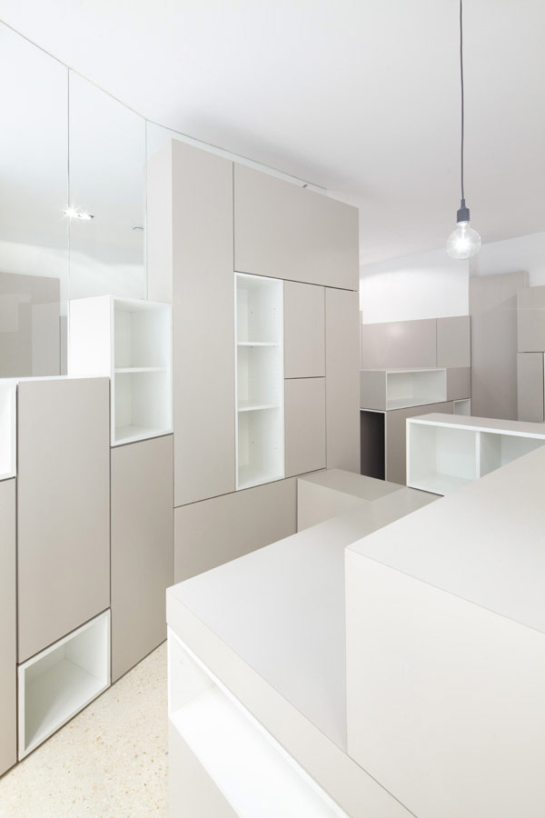 Las dimensiones de estas oficinas miden 65 metros cuadrados , un trabajo desarrollado y completado por h2o architectes quienes tambien se encargaron de la decoracion de los interiores y la muebleria , basandose en un diseño que explota el ambiente geometrico y de uniformidad.