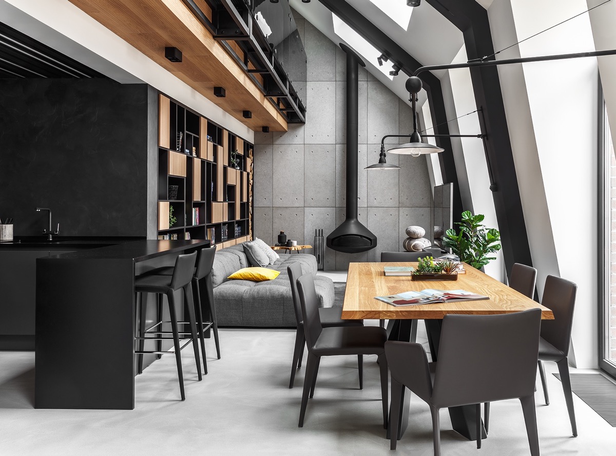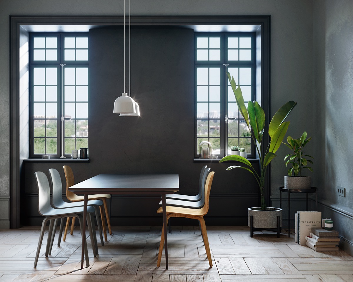Una pequeña lámpara colgante queda relegada a un segundo plano frente a las gruesas sillas de comedor negras.