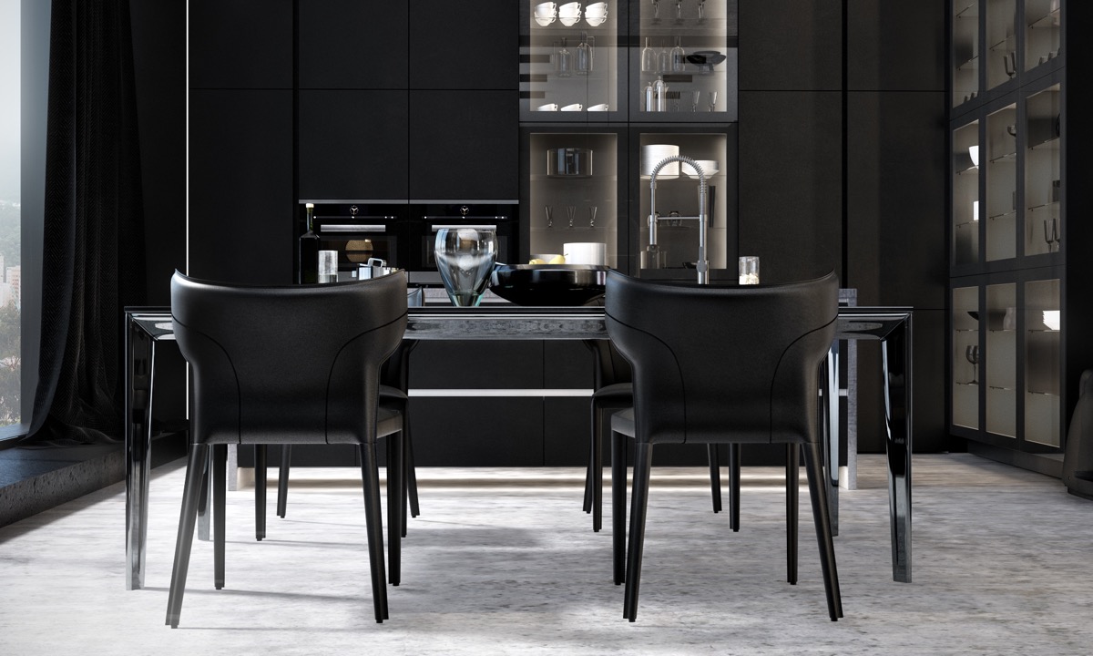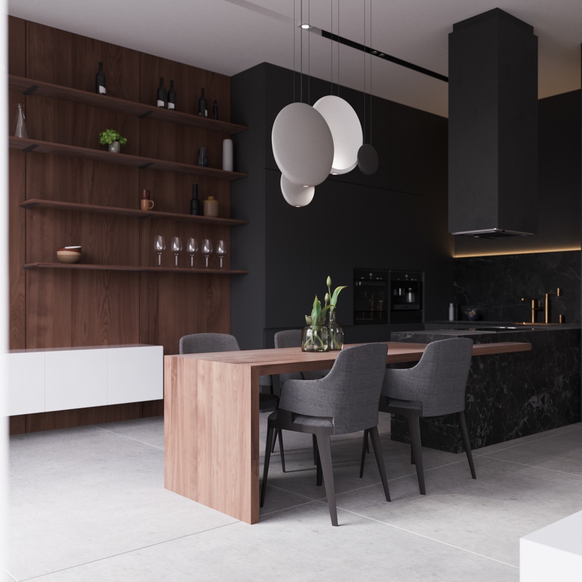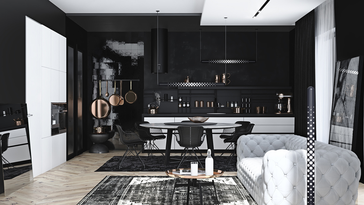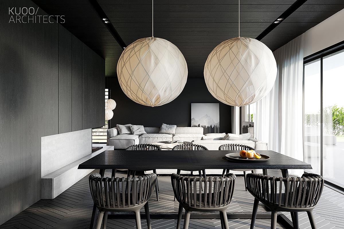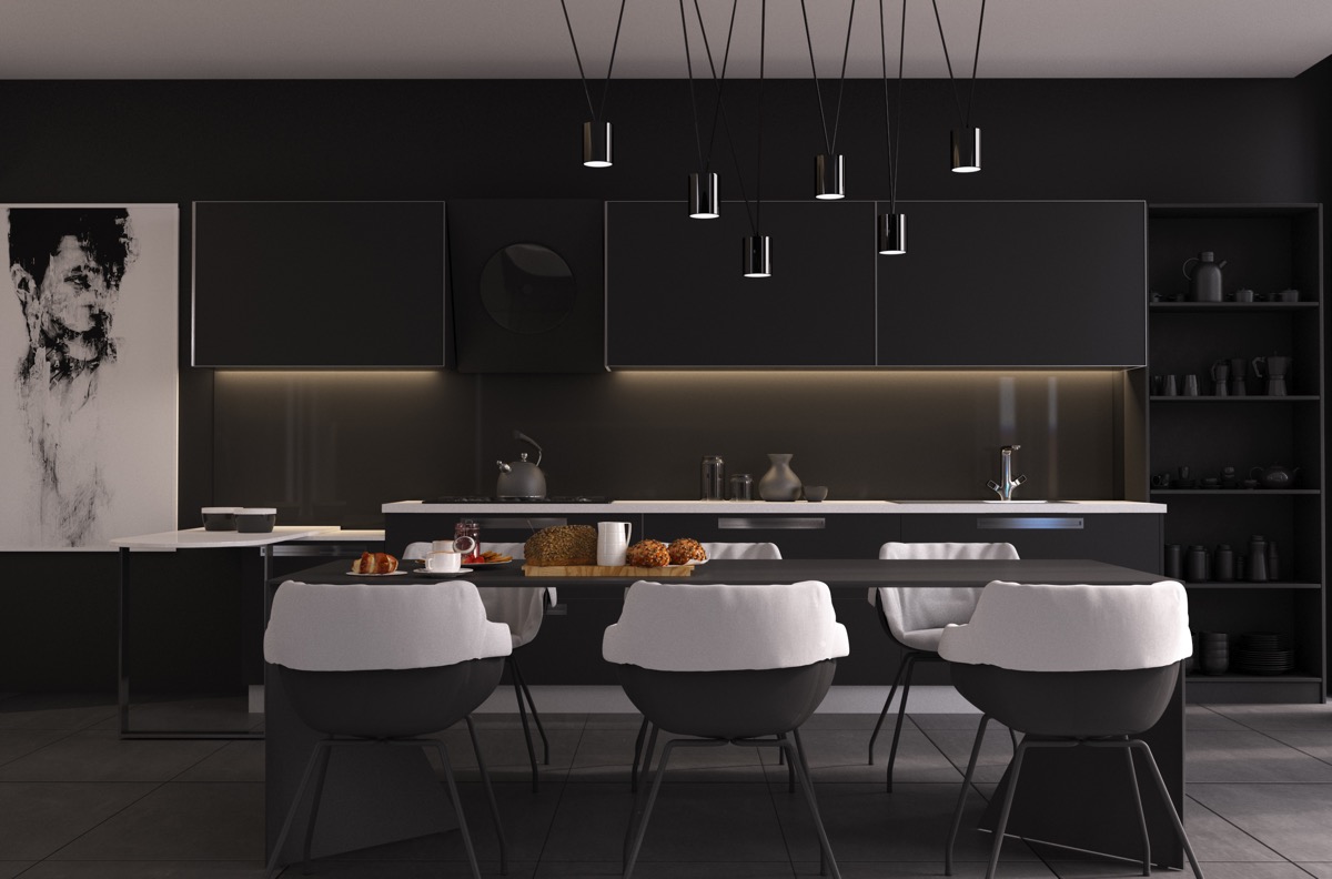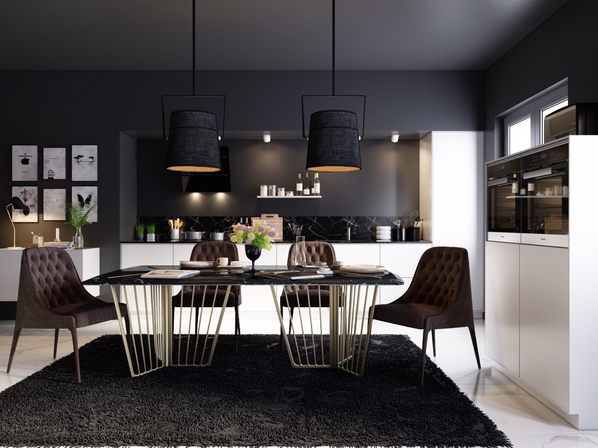 Nuestro primer esquema de comedor negro está unido a una cocina negra de planta abierta. La encimera de la cocina es blanca, y las sillas negras del comedor tienen una punta blanca a juego. La moderna lámpara de araña con pequeñas pantallas negras forradas de blanco es la Match de Vibia. Todos estos detalles en blanco son suficientes para perfilar las formas de la oscura cocina comedor.