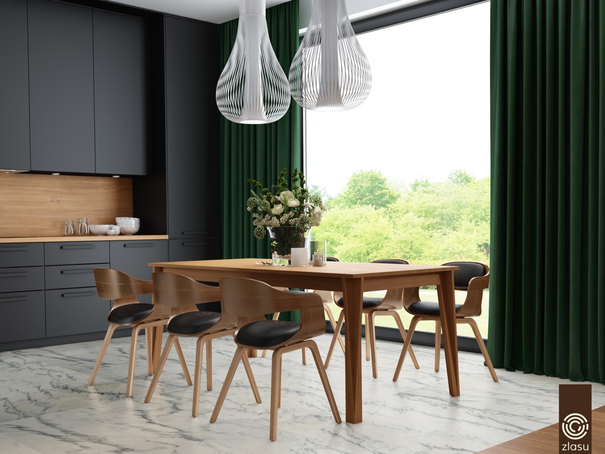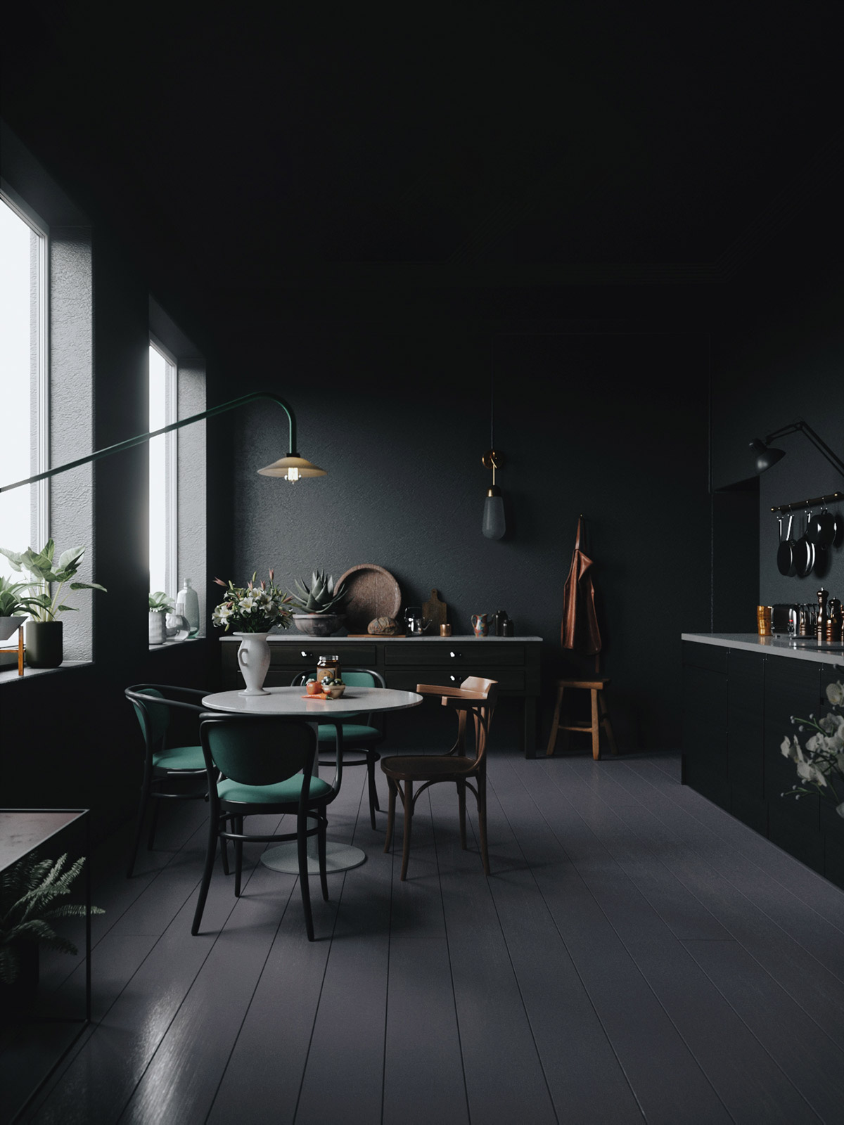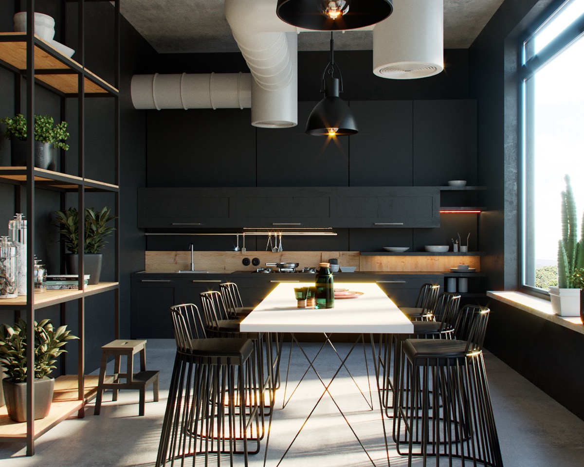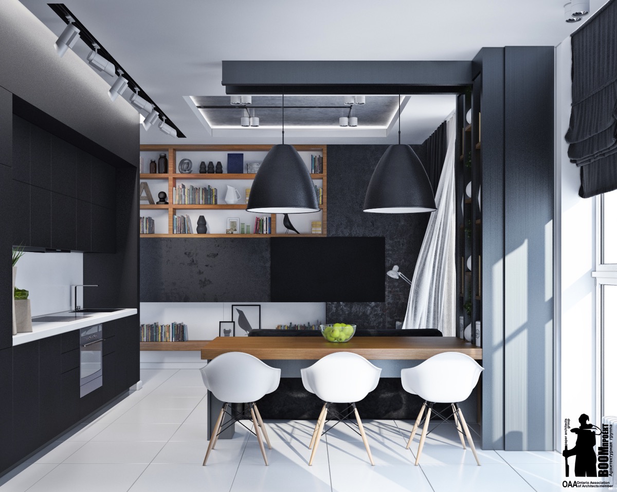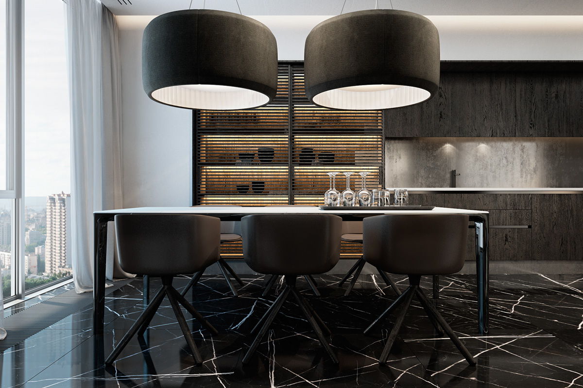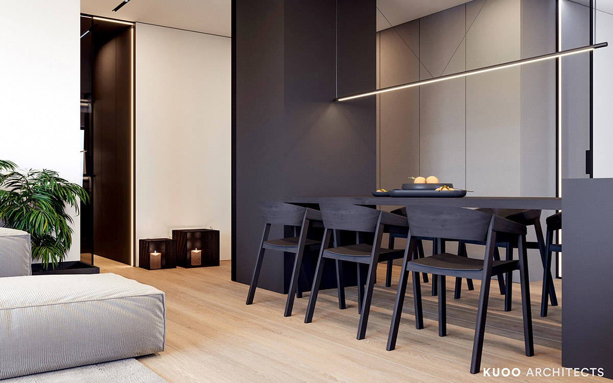 Nuestro primer esquema de comedor negro está unido a una cocina negra de planta abierta. La encimera de la cocina es blanca, y las sillas negras del comedor tienen una punta blanca a juego. La moderna lámpara de araña con pequeñas pantallas negras forradas de blanco es la Match de Vibia. Todos estos detalles en blanco son suficientes para perfilar las formas de la oscura cocina comedor.