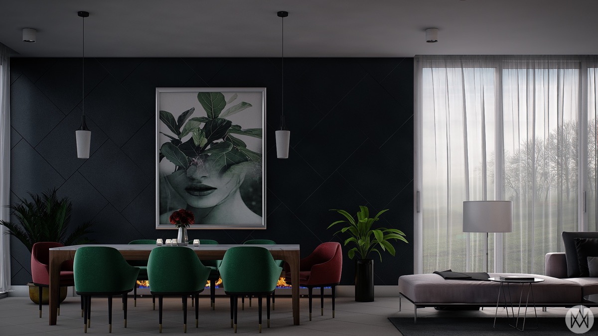 Las lámparas colgantes globo se reflejan sobre la superficie blanca de esta mesa de comedor negra. Un conjunto de ocho sillas verde botella aporta un sutil colorido a las paredes negras.