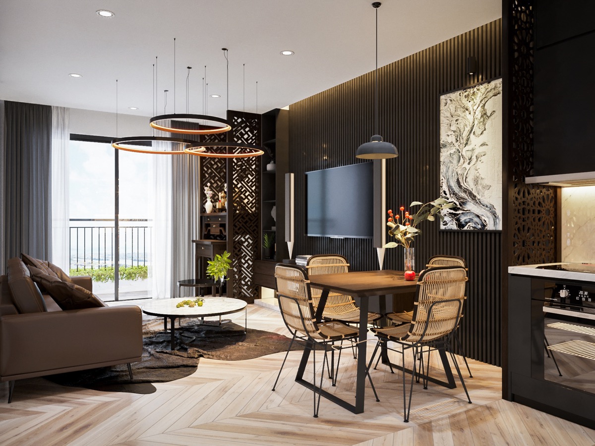 Cuatro sillas de ratán claro alivian la luz en este interior oscuro, junto con un suelo de madera clara en espiga. Las paredes negras están cubiertas de listones para crear luz y sombra adicionales.