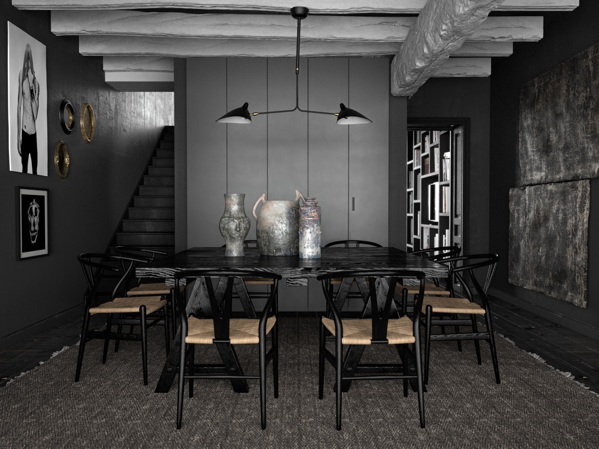 Podrías limitar la decoración de tu comedor negro a una sola pared, a una pared divisoria parcial o a un volumen de almacenaje empotrado.
