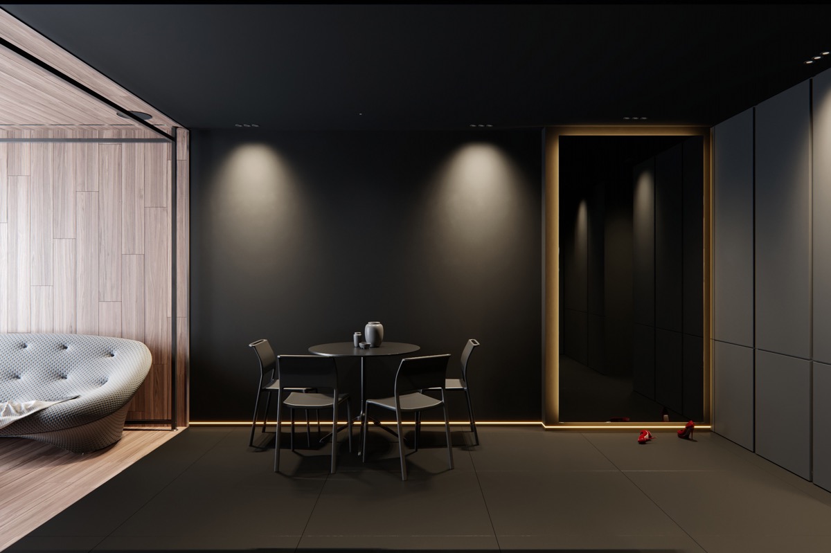 La iluminación del zócalo crea un brillo intrigante detrás de esta sencilla mesa de comedor redonda negra.