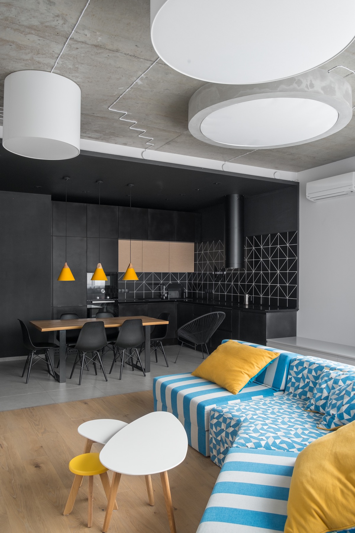 Las sillas negras de la mesa de comedor casi se pierden contra una cocina de color negro sólido, pero tres lámparas colgantes amarillas y un tablero de madera clara marcan brillantemente la zona de comer. Puedes conseguir las sillas Eames negras aquí, y la silla Acapulco aquí.