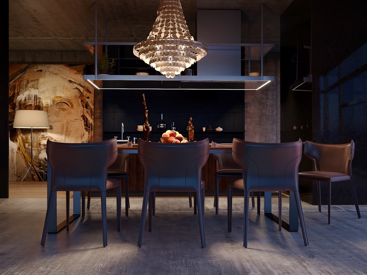 Este comedor oscuro utiliza una enorme obra de arte para añadir luz y textura a la estancia, junto con el brillo de una lámpara de araña.