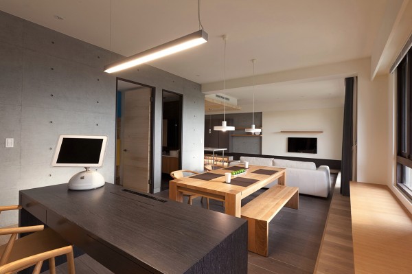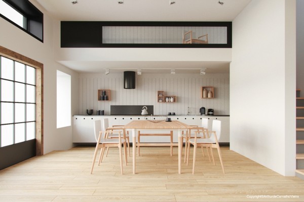 Este comedor abierto aprovecha los techos altos y una planta diáfana en su diseño. Las sencillas y delicadas sillas moldeadas entran en contacto con la formidable mesa de madera, que deja espacio de sobra incluso para la comida más elaborada. Las lámparas del comedor son los colgantes Beat de Tom Dixon.