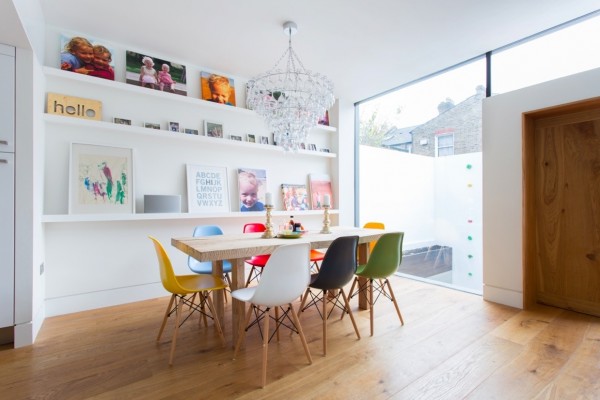 En este divertido comedor, el diseñador ha elegido un arco iris de sillas que combinan a la perfección con el cálido suelo de madera y las paredes blancas. Este espacio sería perfecto para celebrar una fiesta de pijamas.