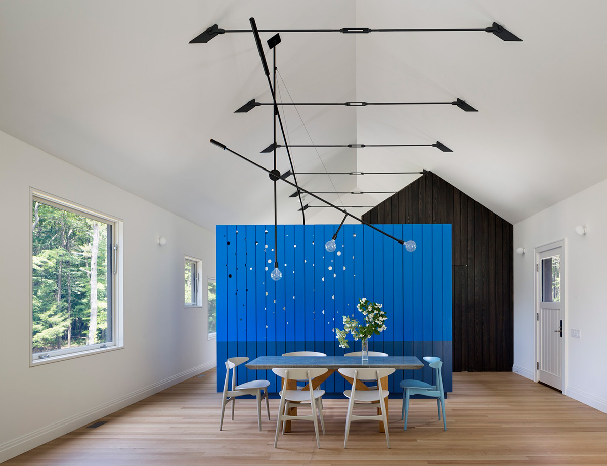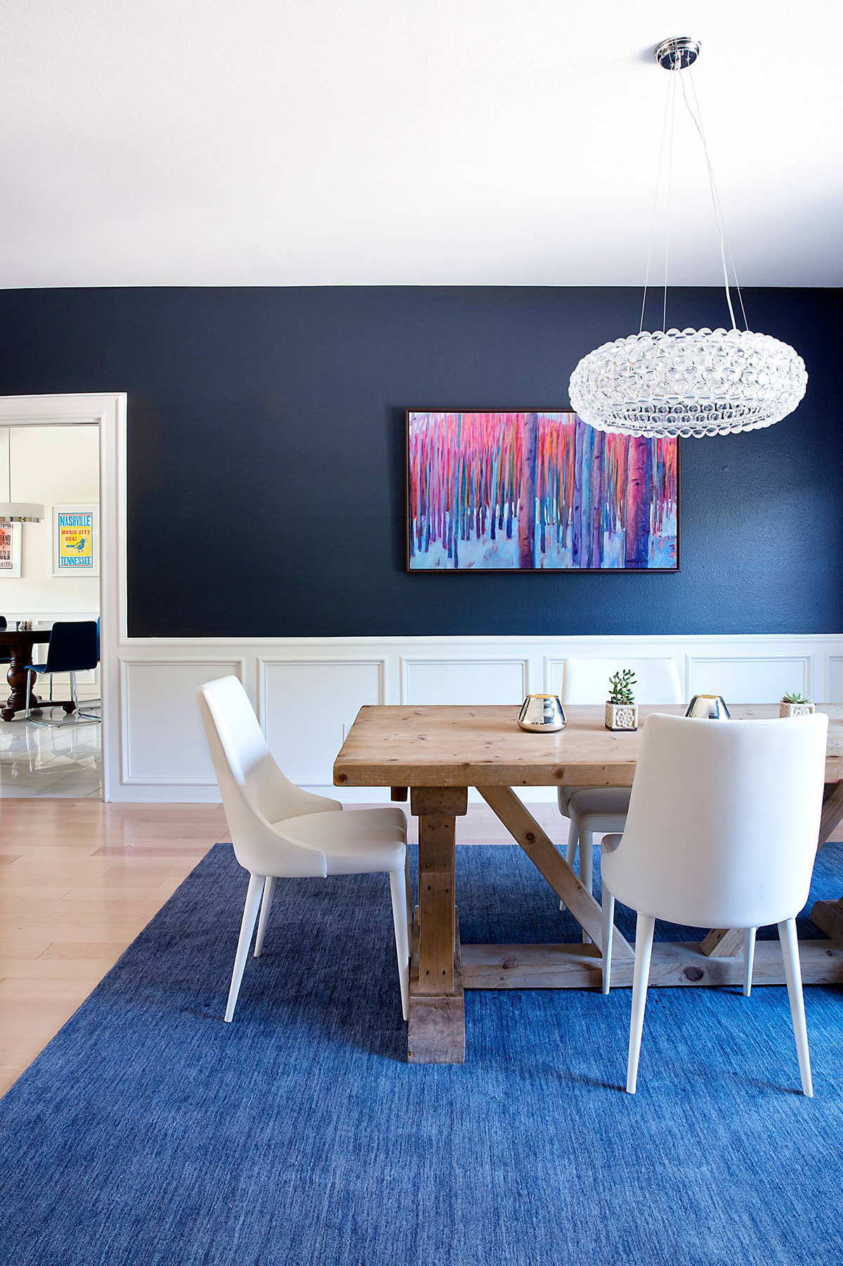 Construya una pared divisoria azul para dar a un comedor de planta abierta su propia identidad luminosa.