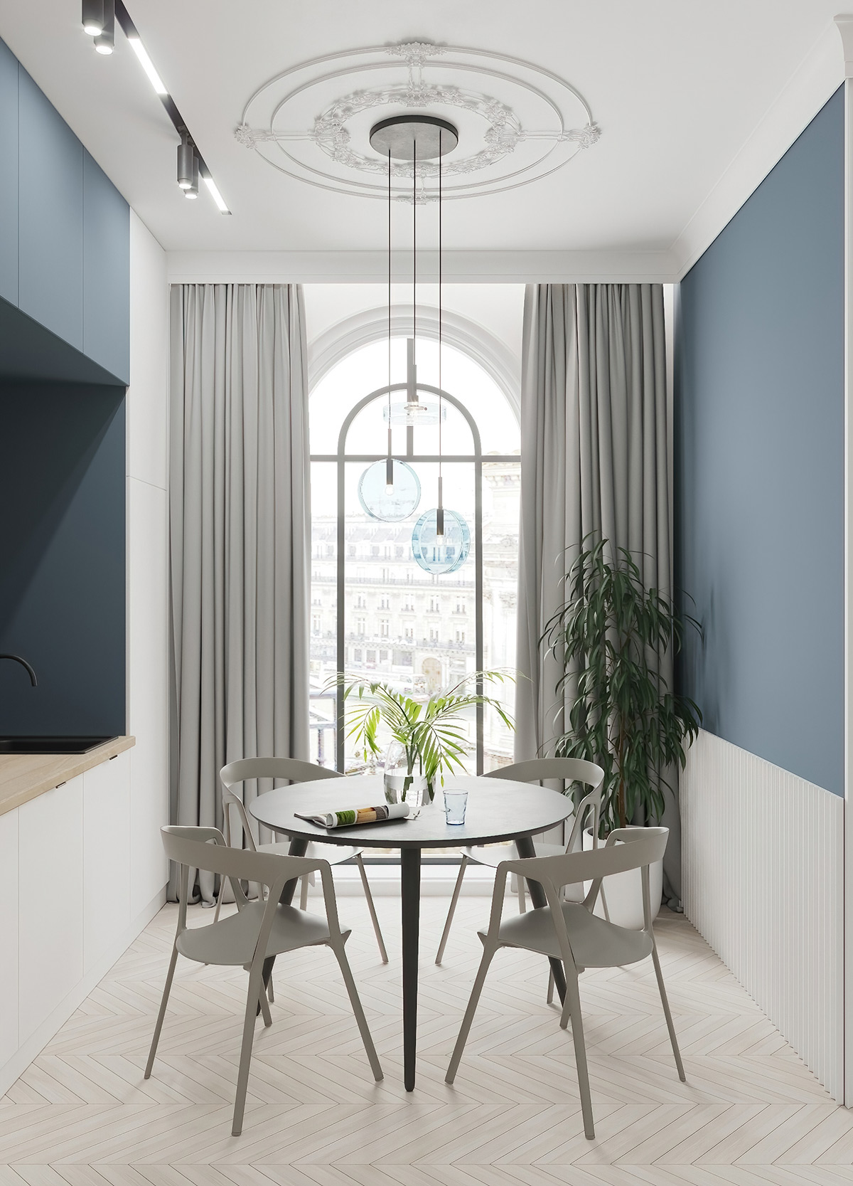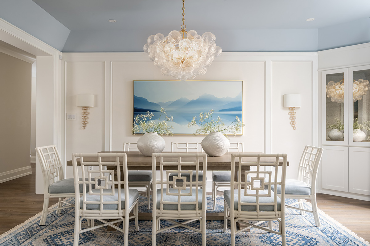 Elige tonos azules claros y apagados para crear un perímetro sutil alrededor de muebles de comedor muy decorativos y arañas de cristal ornamentadas.