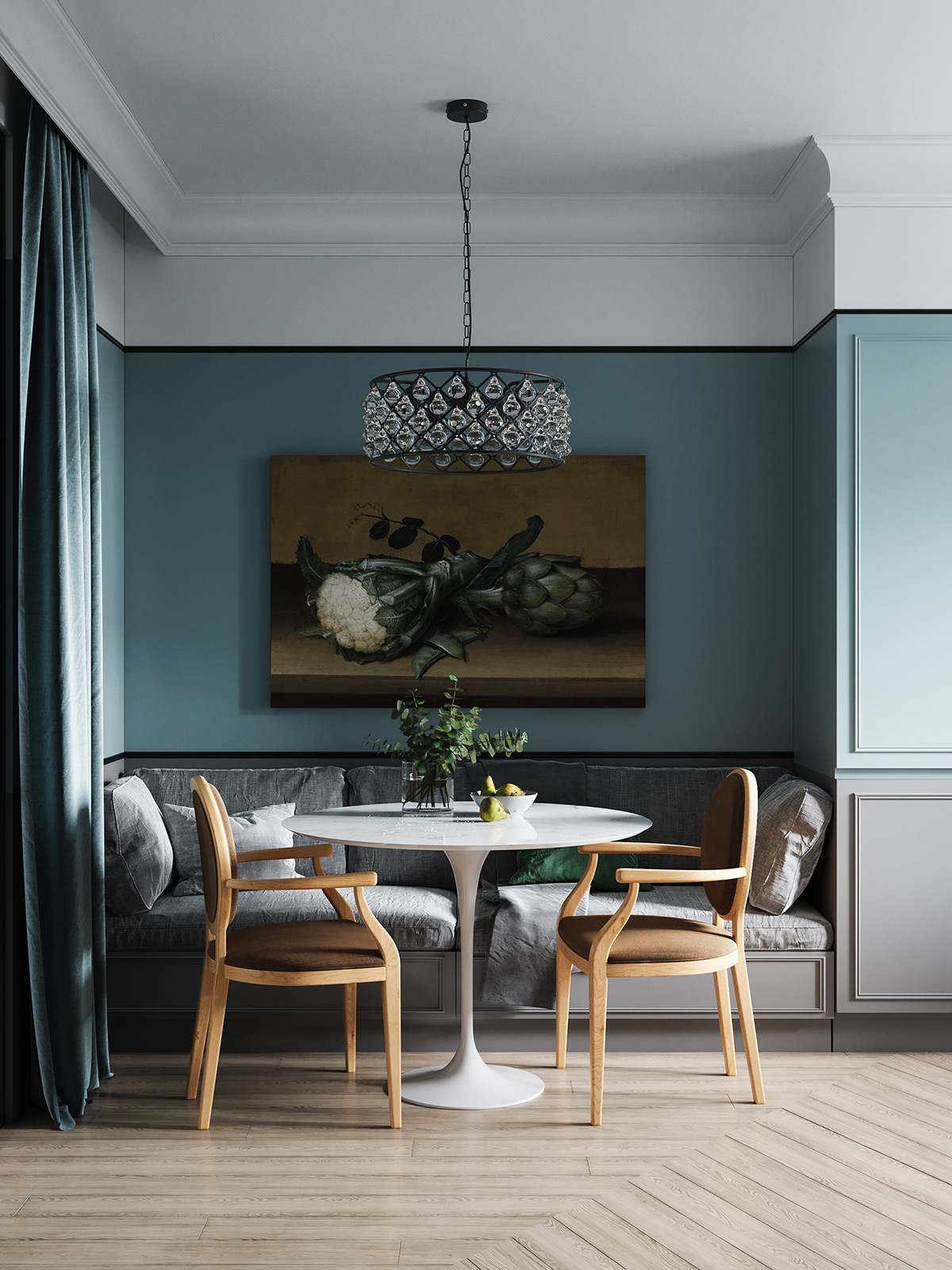 Este rincón de comedor formal adquiere un aire sofisticado con una combinación de paredes en verde azulado y gris.