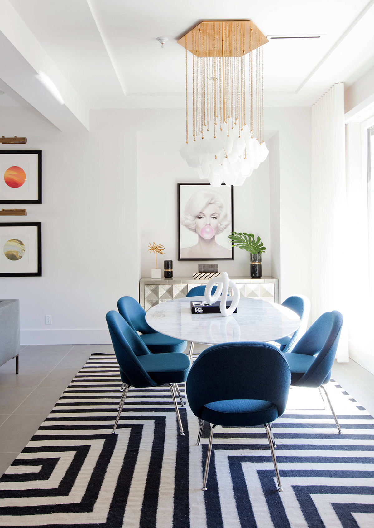 Cree un aspecto artístico con una atrevida alfombra de comedor geométrica, una iluminación deslumbrante y un arte de pared estrafalario.