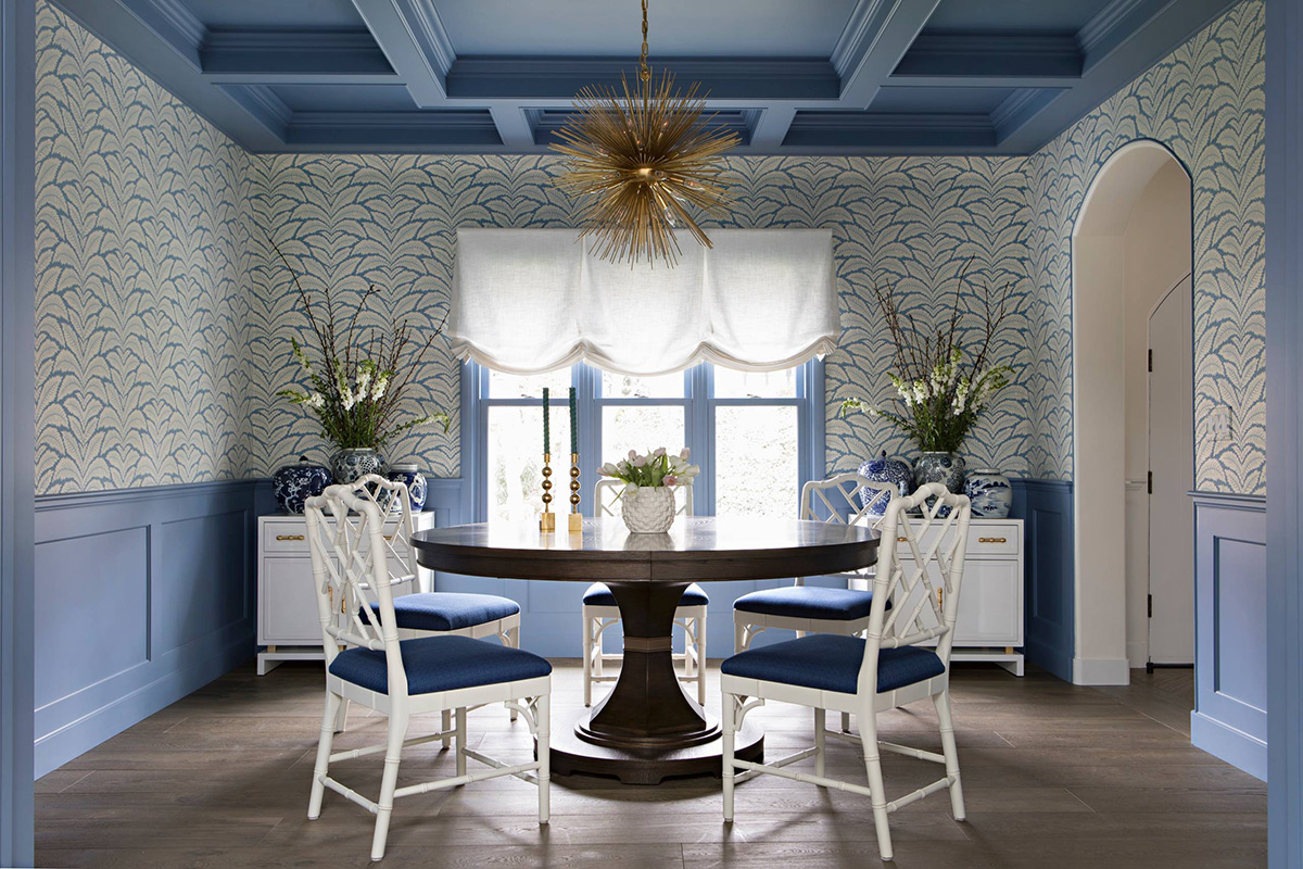Un elegante papel pintado da un aire clásico a un comedor azul. Elige delicados motivos botánicos como decoración de pared de comedor para crear un encanto elegante.