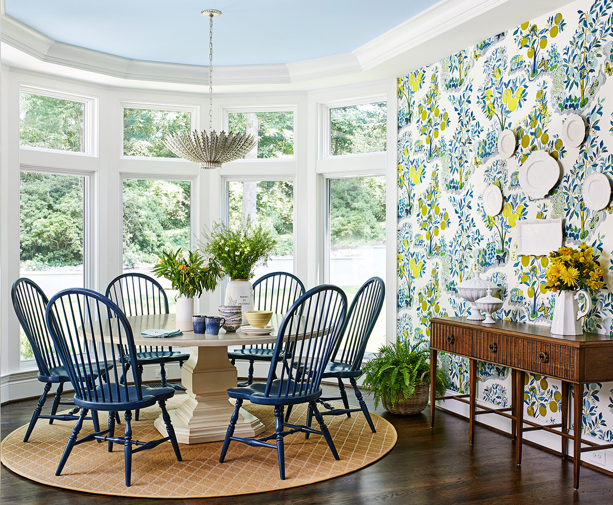 Un mural botánico con fondo azul cielo te hará sentir como si estuvieras cenando al aire libre. Aquí, una alfombra de comedor verde sugiere un «césped» bajo los pies.