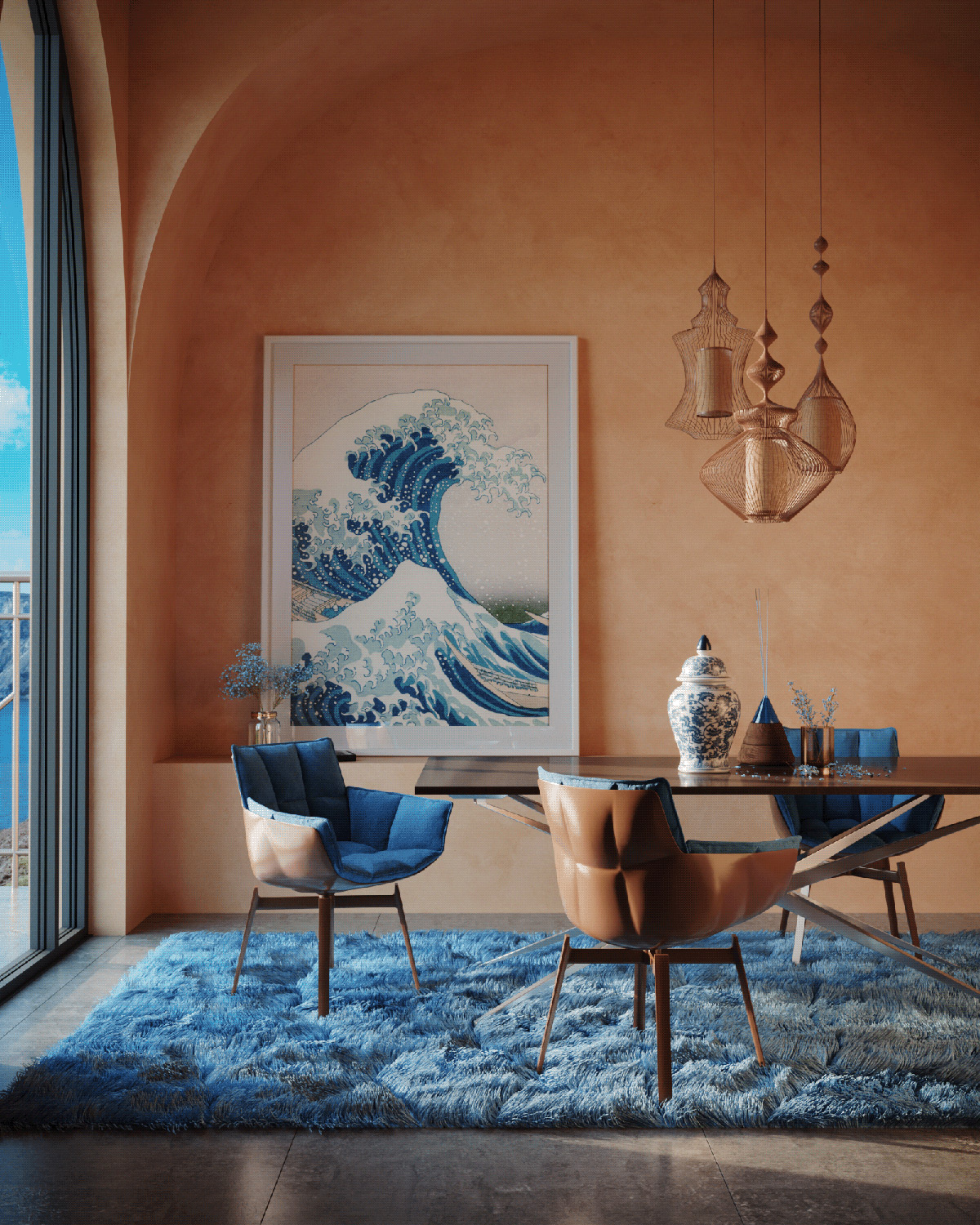 Combine elementos azul cobalto con terracota cálida para dar estilo a un comedor con profundidades cálidas
