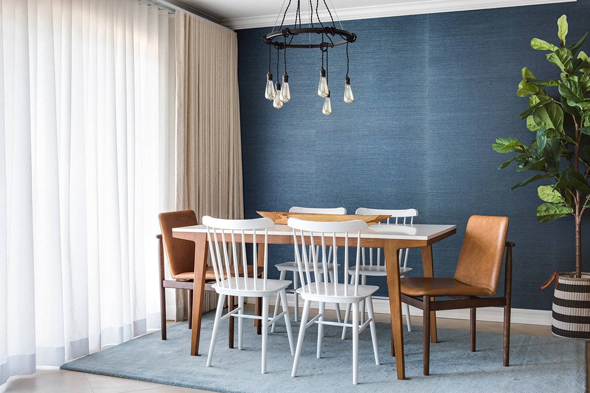 Este comedor de estilo escandinavo combina una pared en azul real con un juego de comedor en blanco y madera natural.
