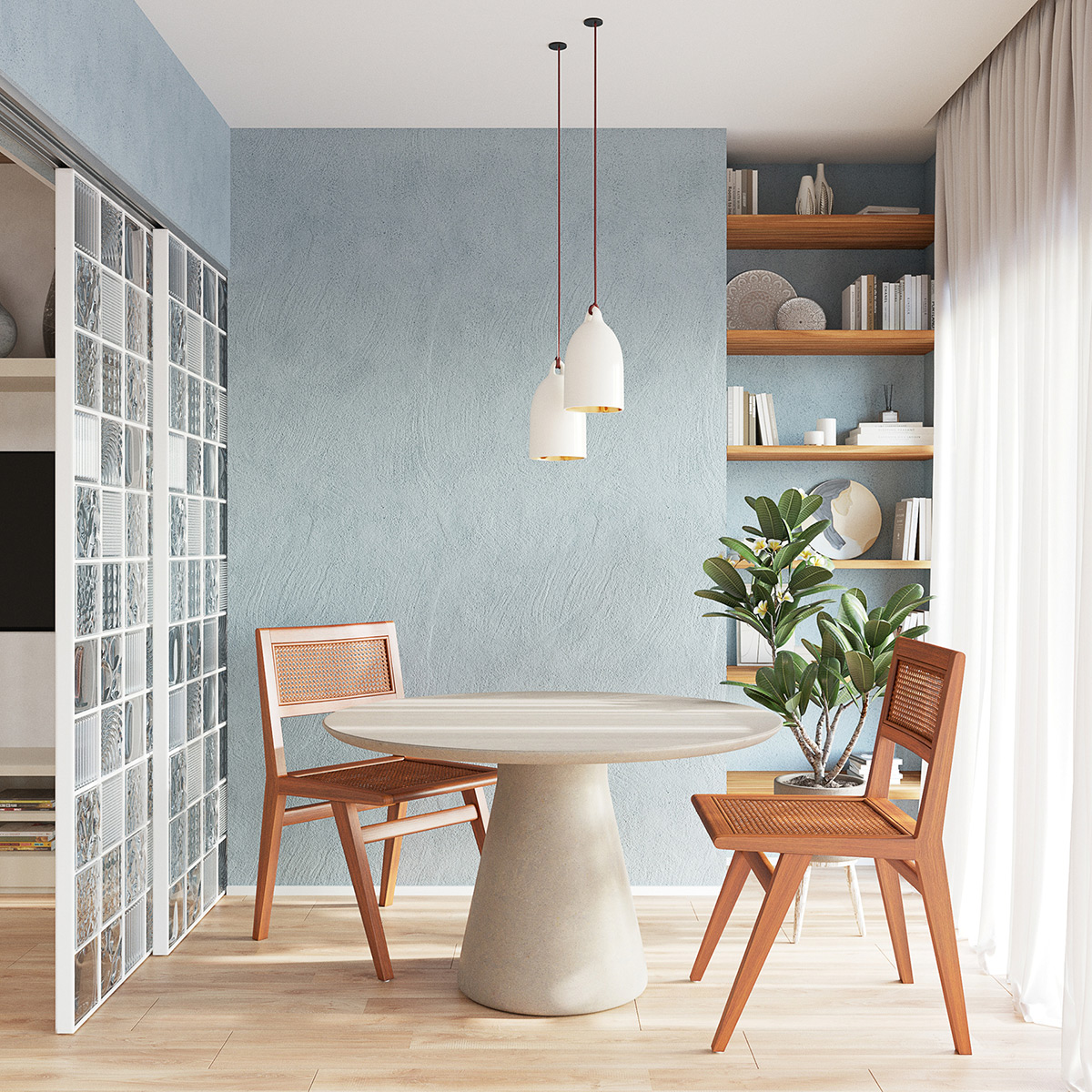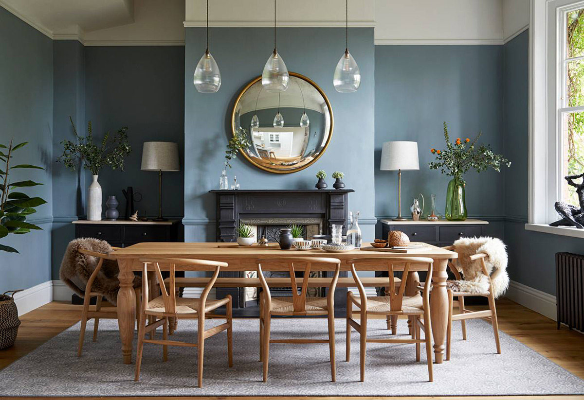 El azul huevo de pato suaviza una escena tranquila y serena en el comedor.