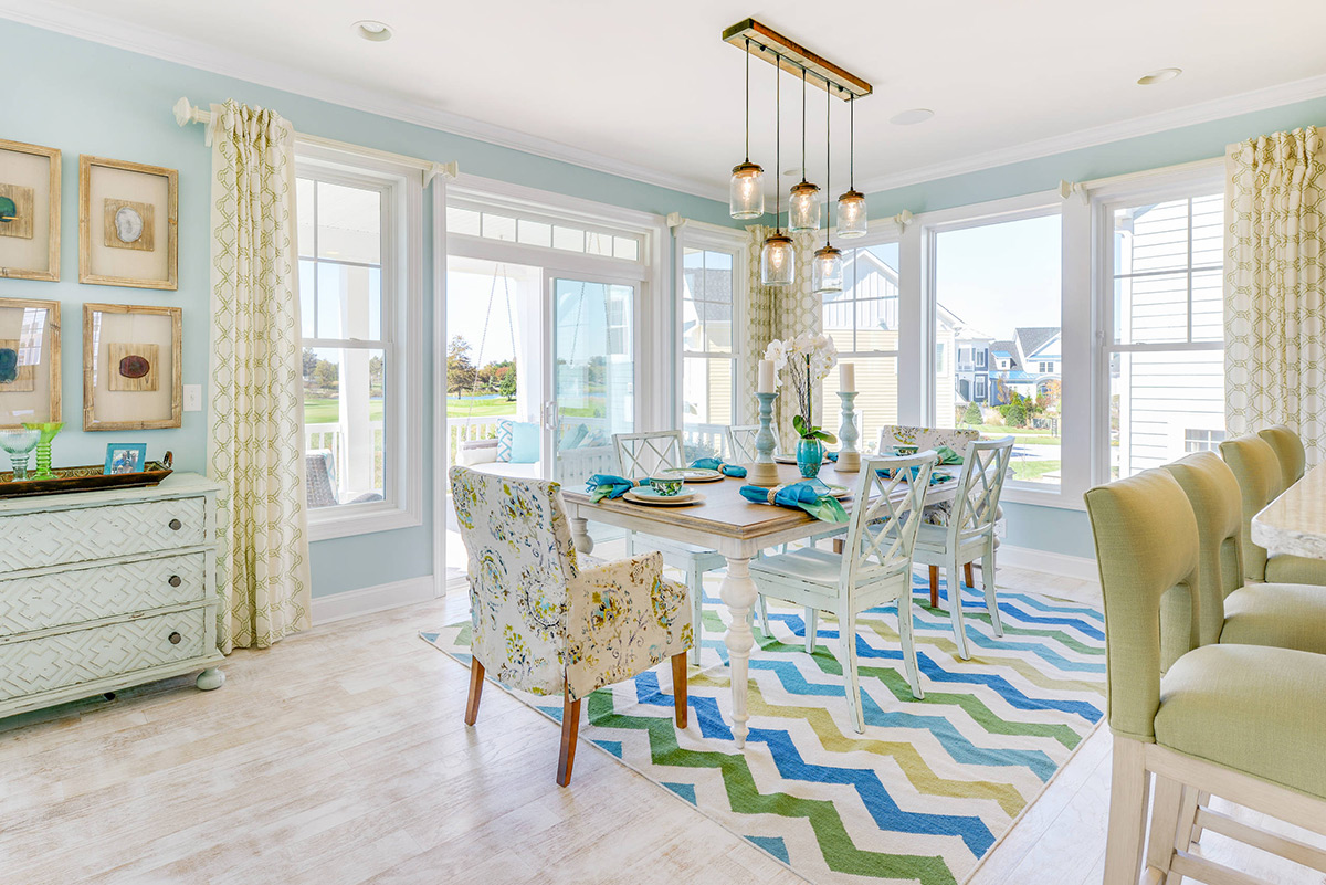 Coloca una alfombra de comedor azul para afianzar tu combinación de colores.