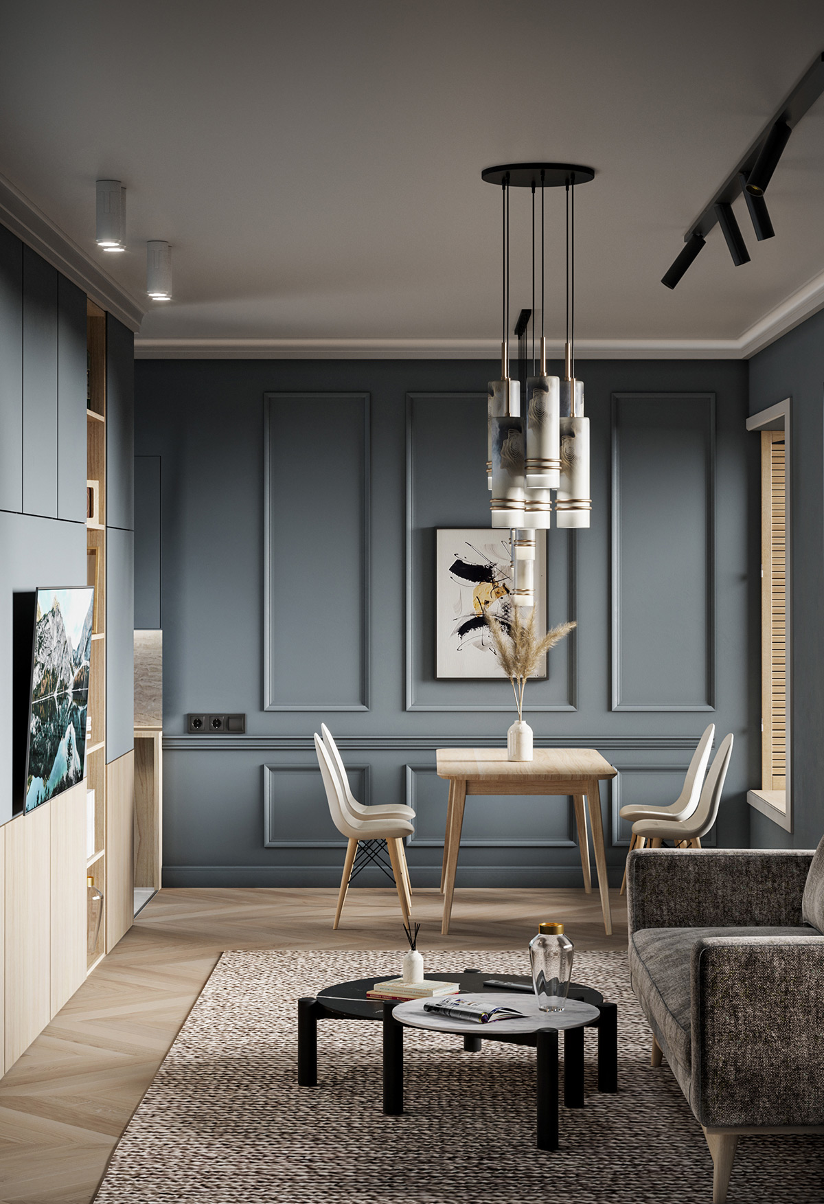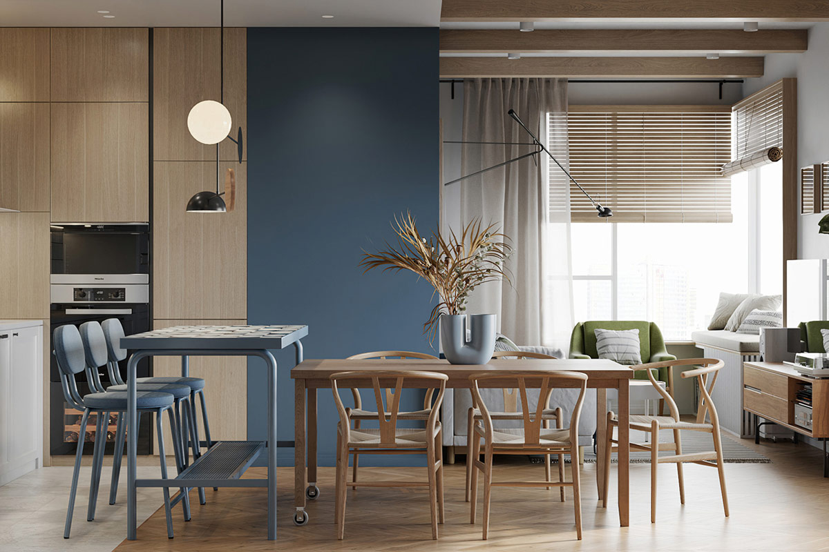 En este concepto, se utiliza un acabado azul para delimitar una barra de comedor de una mesa de comedor más formal.