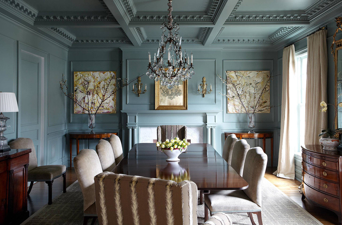 Los azules apagados resultan elegantes en un diseño de comedor tradicional. Utilice estos tonos para cubrir sólidamente las paredes altas de arrimaderos y techos profundamente artesonados.
