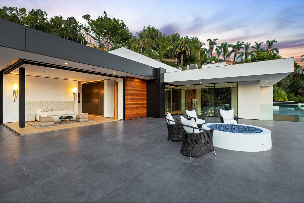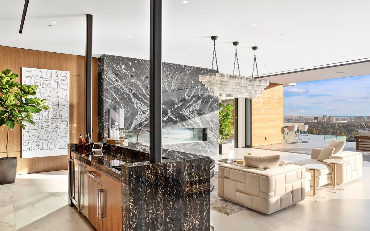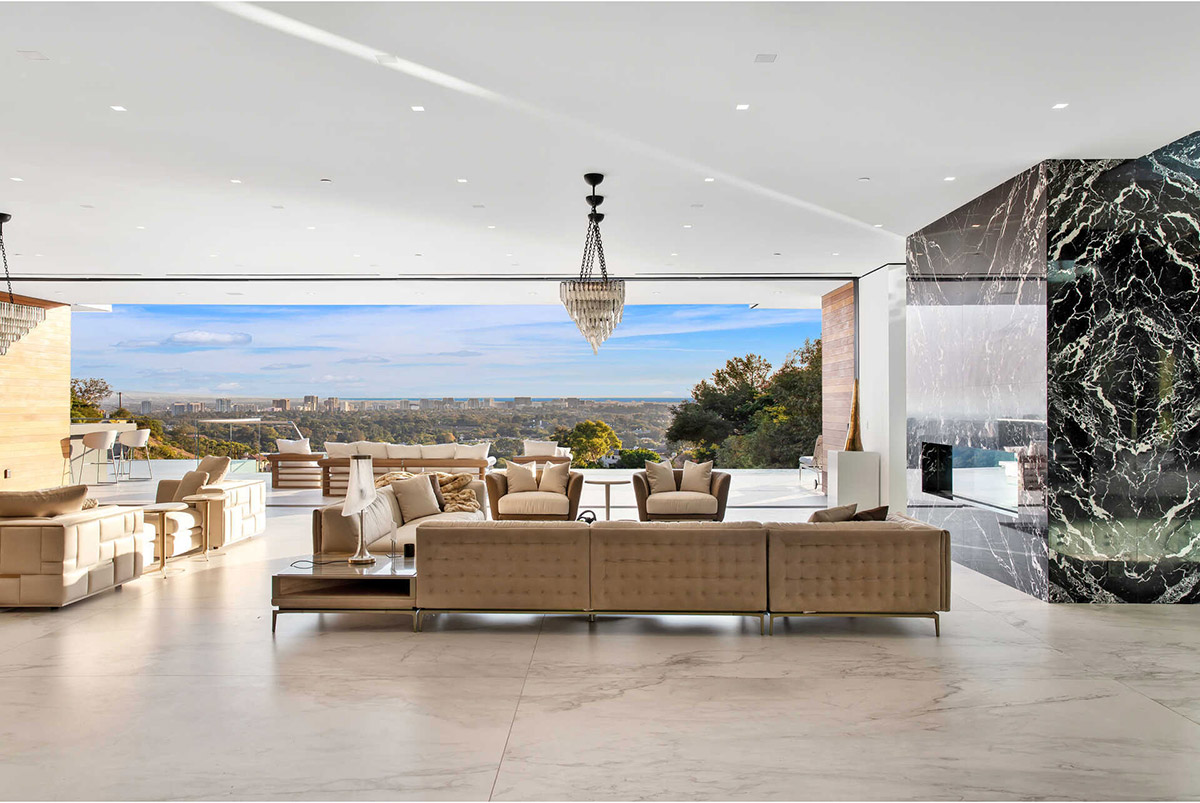 Las enormes puertas correderas de cristal Fleetwood se abren a lo largo de toda la casa, llevando el sol californiano al interior. La brillante luz del sol resalta una chimenea central de mármol negro de Aquitania de 6 metros de altura y doble cara en el salón de planta abierta. Los espaciosos salones están decorados en tonos neutros pálidos para que la fabulosa piedra tenga su momento.