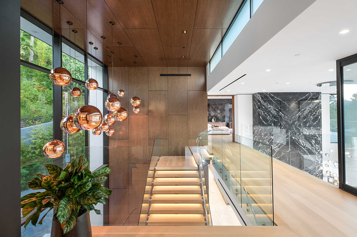 Una abundancia de colgantes de cobre en forma de globo burbujean a lo largo del espacio del techo de la entrada acristalada. Los paneles de madera envuelven las paredes interiores y el techo en un tono intenso que combina armoniosamente con la calidez de los tonos metálicos.