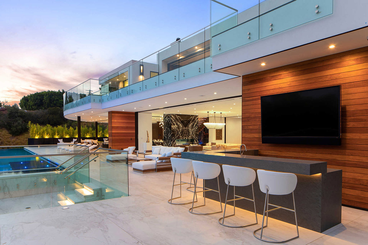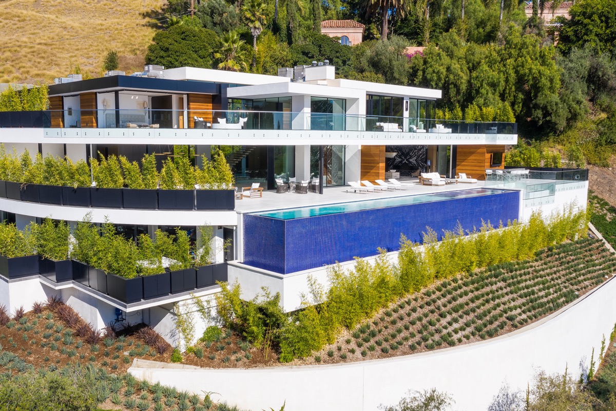 La piscina se adentra en el borde de la propiedad. Los nadadores pueden hacer una pausa en el agua fresca para contemplar las vistas despejadas de Beverly Hills.