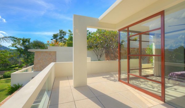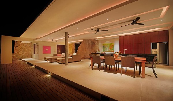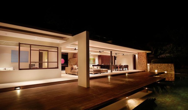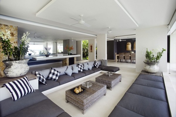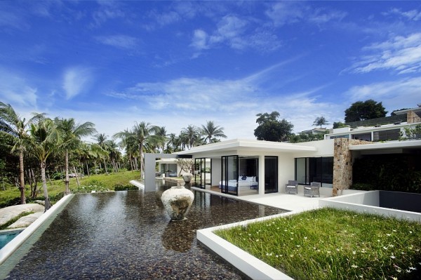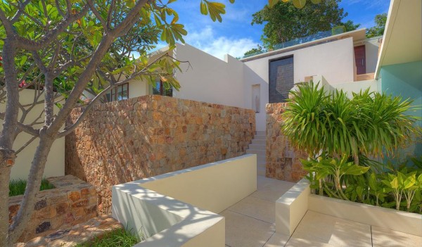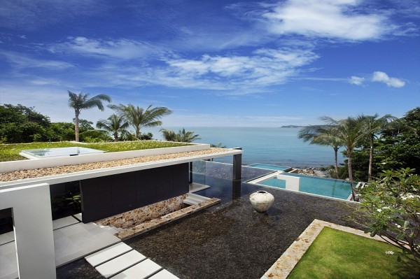 Esta casa en Samujana se asoma al brillante océano, a través de palmeras tropicales que se mecen suavemente, bajo un exuberante jardín con césped en la azotea.