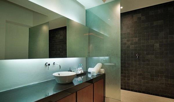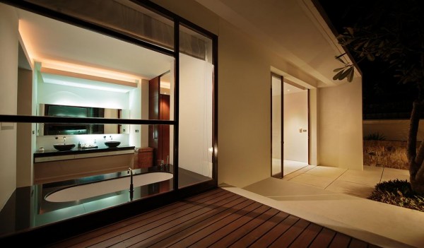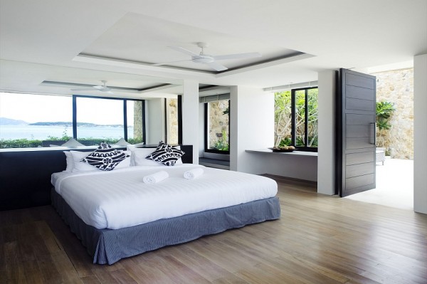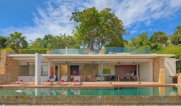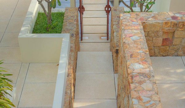 Los sencillos suelos de arenisca blanca mantienen la casa fresca, junto con las gloriosas brisas marinas que soplan a través de las paredes acristaladas retraídas de la casa.