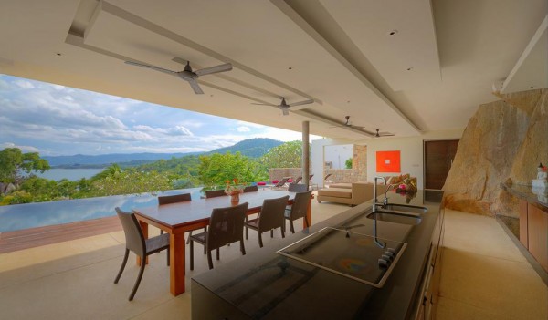 La zona de estar de planta abierta da a una de las muchas terrazas soleadas que rodean la casa, una de las cuales incluye una cocina exterior totalmente equipada con zona de barbacoa.