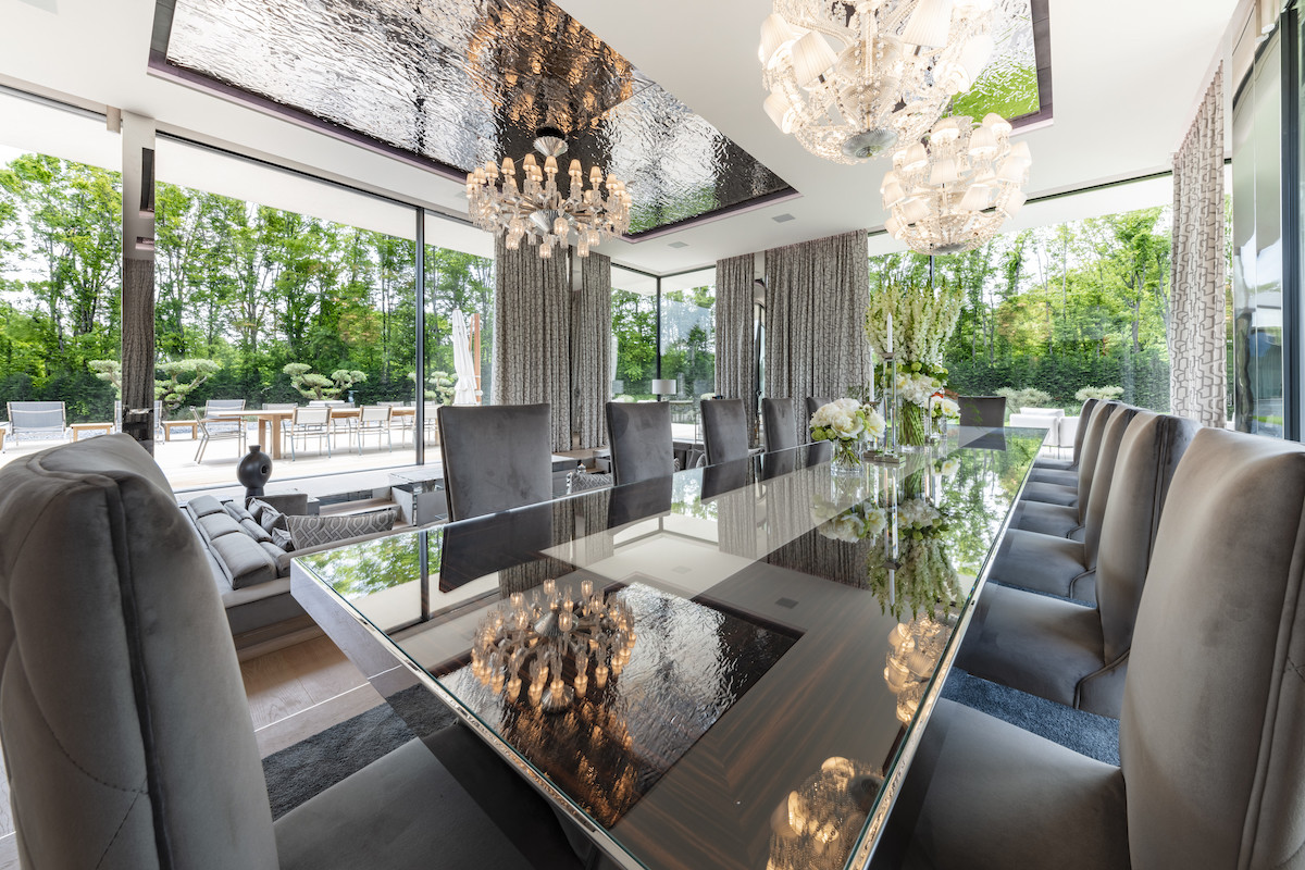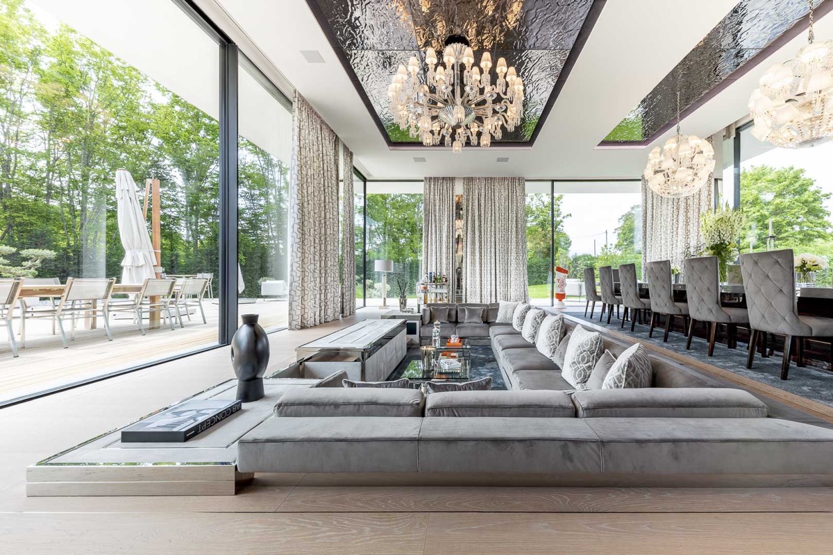 Elegantes lámparas de araña modernas cuelgan de techos reflectantes sobre la zona de asientos y el comedor de detrás. Las molduras de espejo añaden el elemento reflectante a un conjunto de muebles en el rincón de conversación.