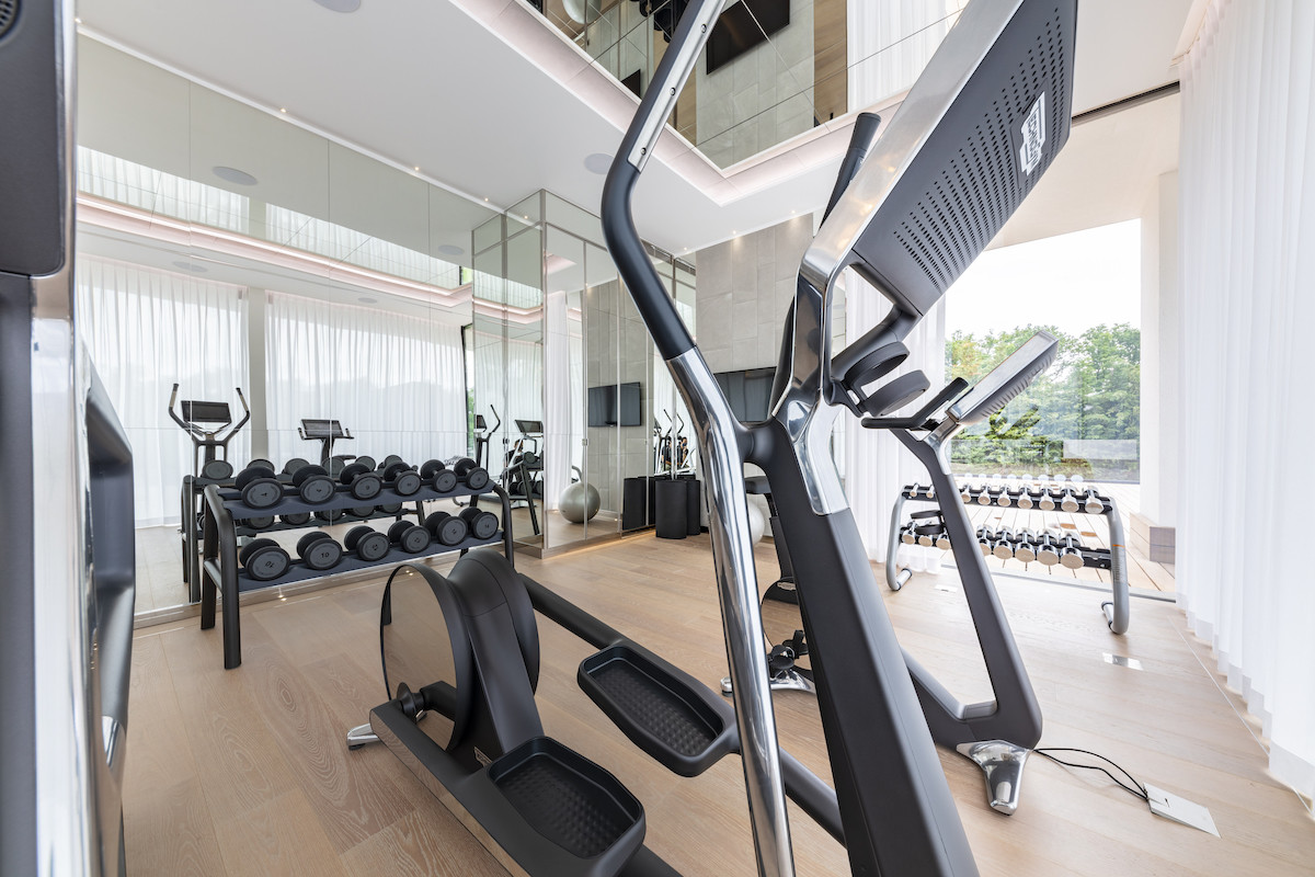 Los enormes ventanales y las paredes de espejo dan al gimnasio un aspecto abierto y aireado.