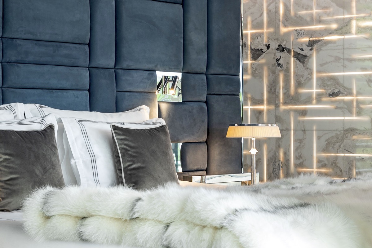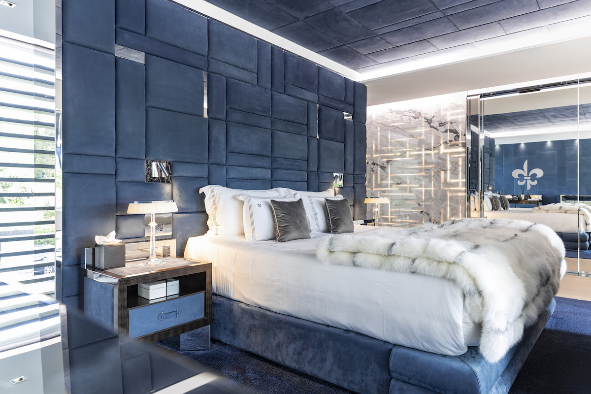 Los detalles en azul oscuro crean una zonificación en este lujoso dormitorio, que aporta a la zona de descanso un profundo contraste con el resto de la fresca decoración blanca de la habitación.