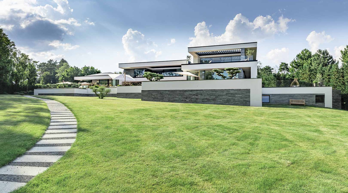 La moderna casa se eleva sobre el atractivo jardín, dando lugar a las amplias terrazas soleadas y a las dos piscinas exteriores.
