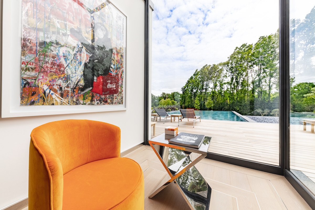 Una silla naranja y una mesa de espejo amueblan un pequeño rincón de lectura en una esquina luminosa con paredes de cristal.