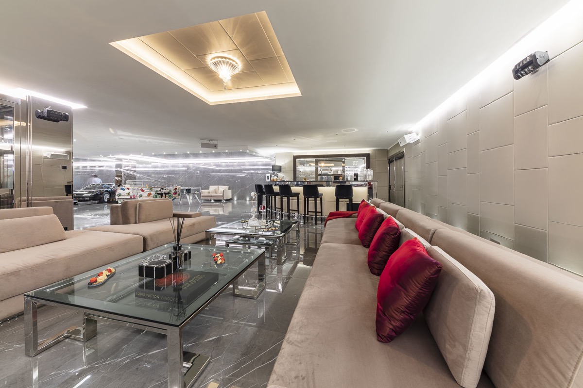 La puerta lateral conduce a un magnífico garaje, similar a una galería de arte, que puede albergar hasta 10 coches. Este espacio único alberga salas de estar con juegos arcade, una bodega y un comedor teppanyaki. Las paredes de mármol blanco y la iluminación perimetral LED dan forma a una estética luminosa y llena de energía.