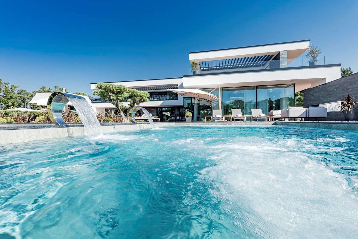 Las cascadas brotan en la piscina de un azul resplandeciente, creando una relajante banda sonora para un comedor al aire libre y una terraza para tomar el sol.