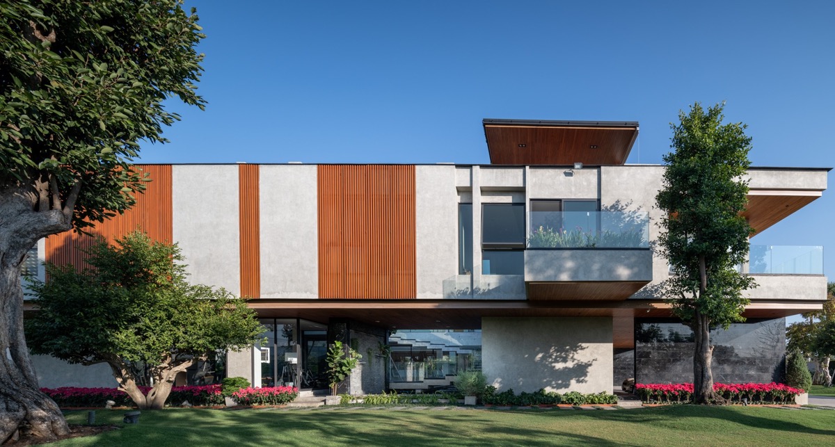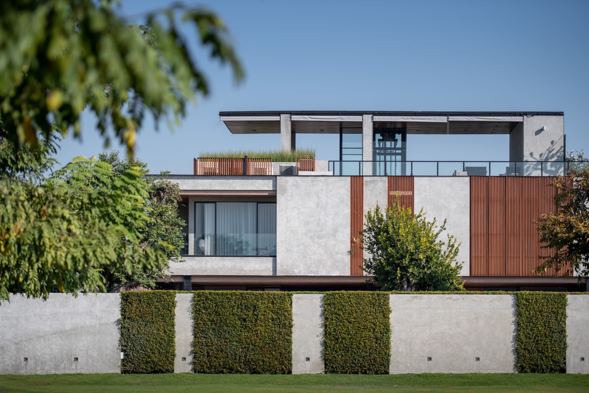 Una vez pasado el límite, el moderno exterior es un diseño lineal compuesto de hormigón armado y revestimiento de madera teñida. El aparcamiento está a la sombra.