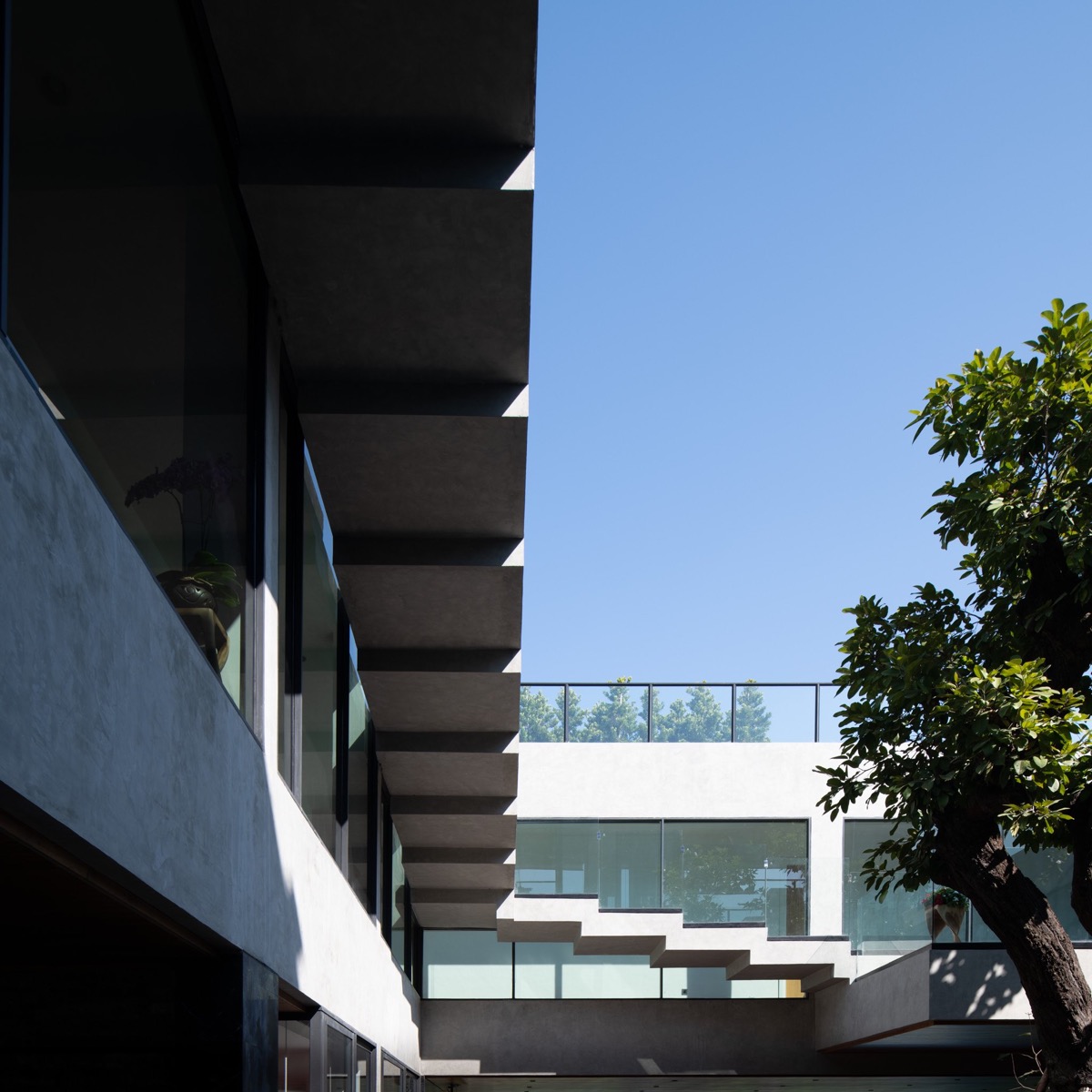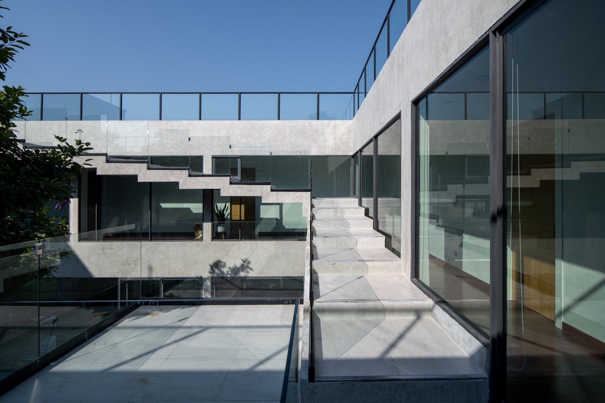 El segundo «bucle» del espacio es una escalera de hormigón que abraza el patio central.